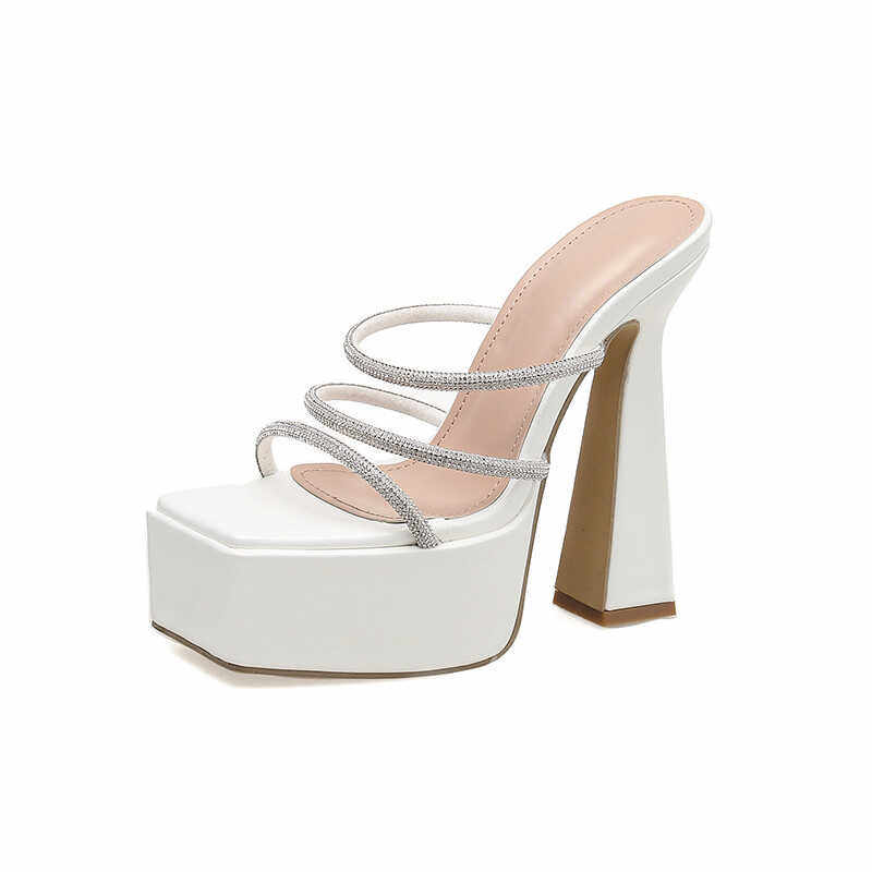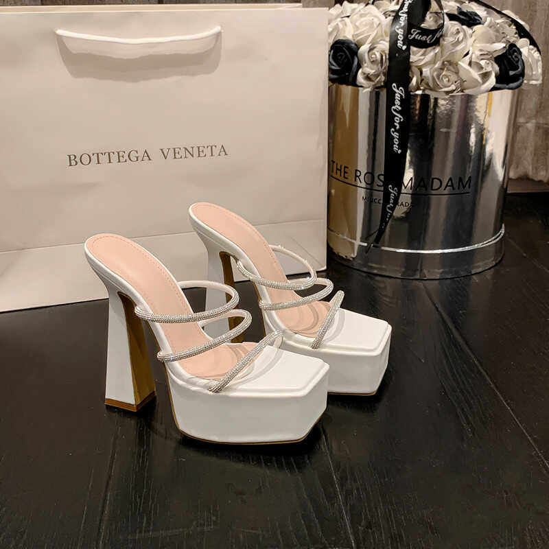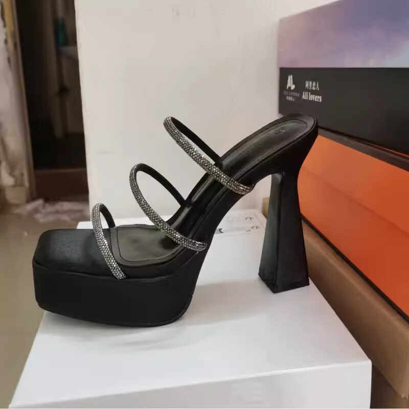 13cm粗跟厚底凉拖鞋夏水钻防水台模特走秀夜场舞台方头超高跟女鞋