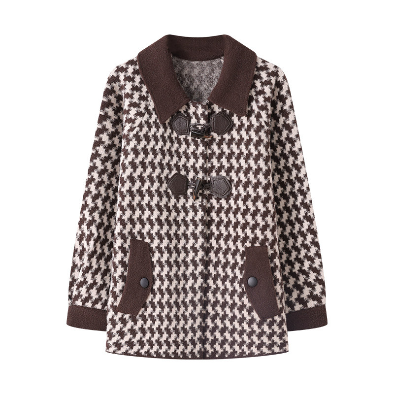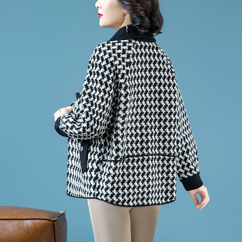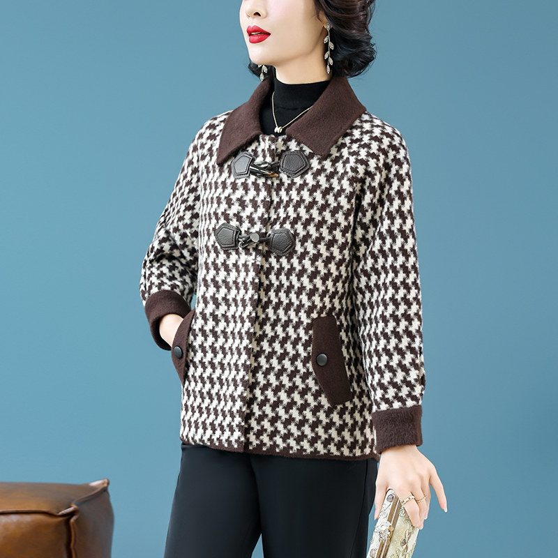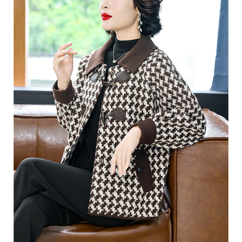 妈妈春装洋气千鸟格外套中年女短款毛呢中老年春秋季时尚上衣套装