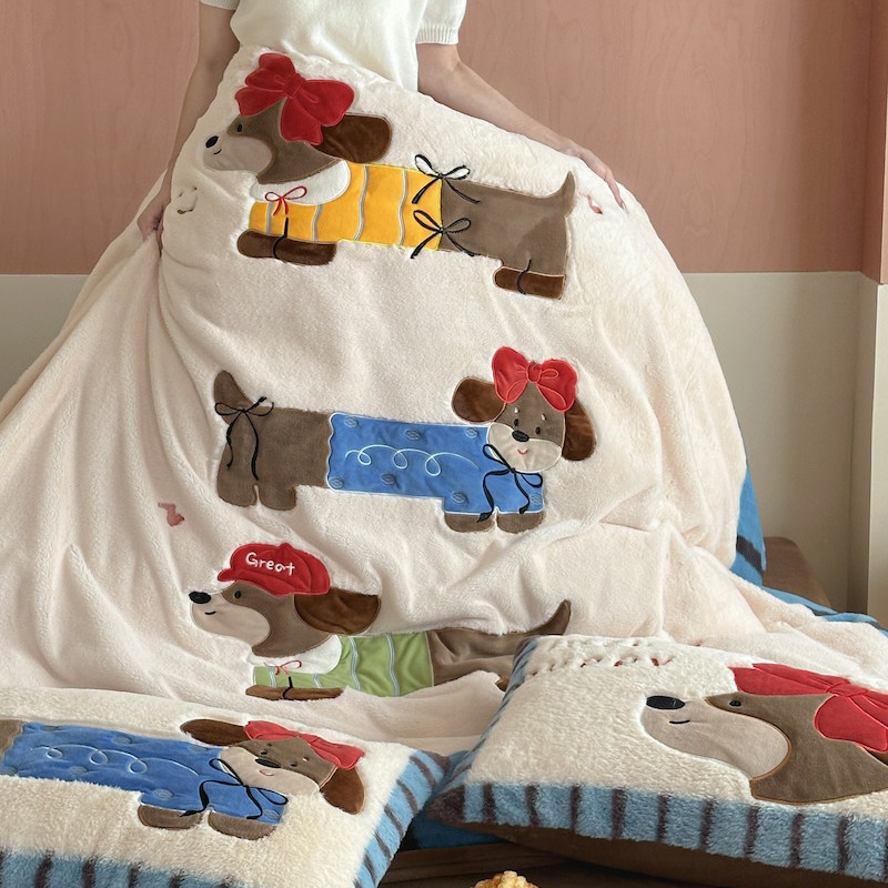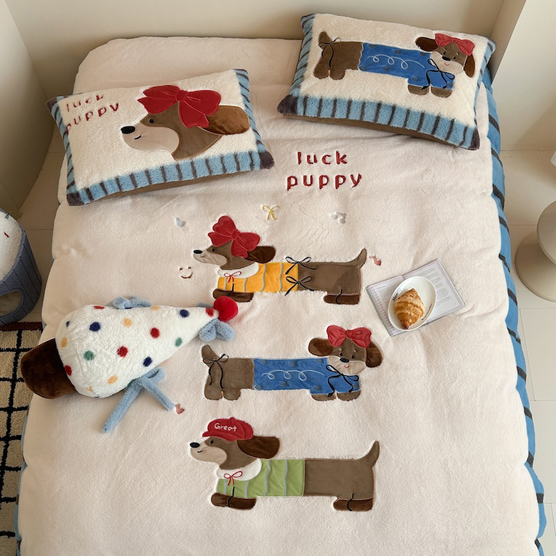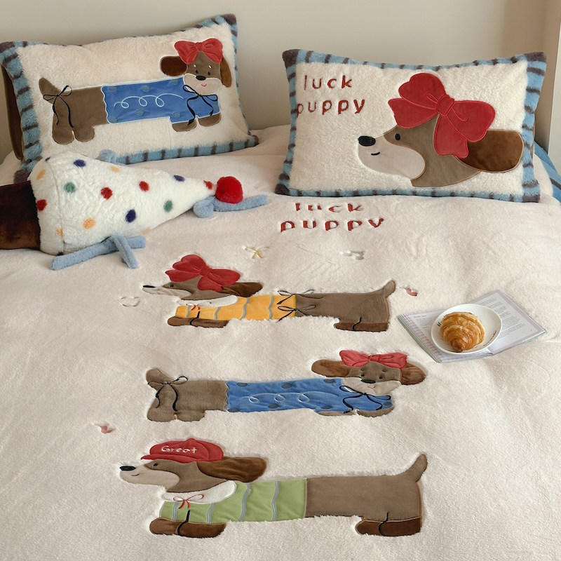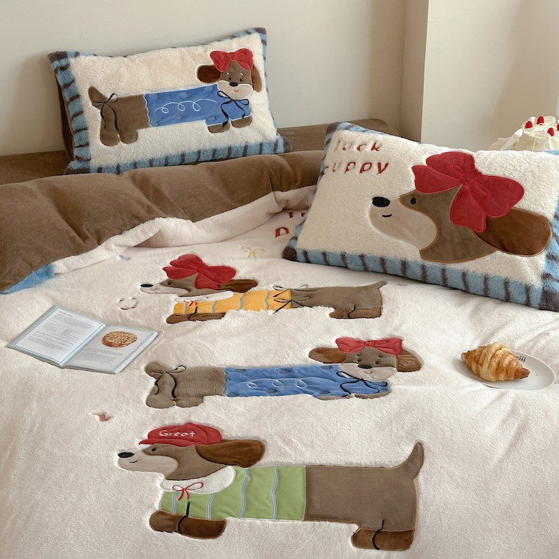 卡通腊肠狗秋冬加厚兔毛绒牛奶绒保暖四件套珊瑚绒法兰绒床上用品