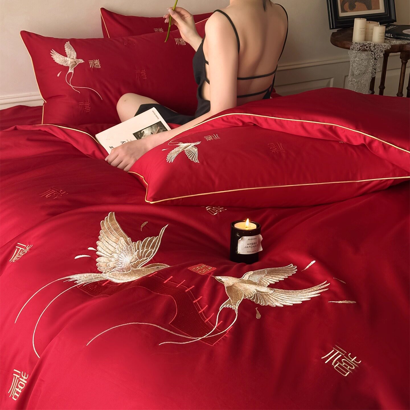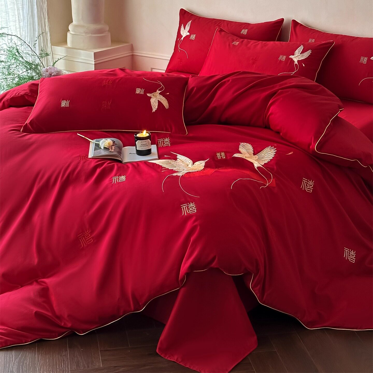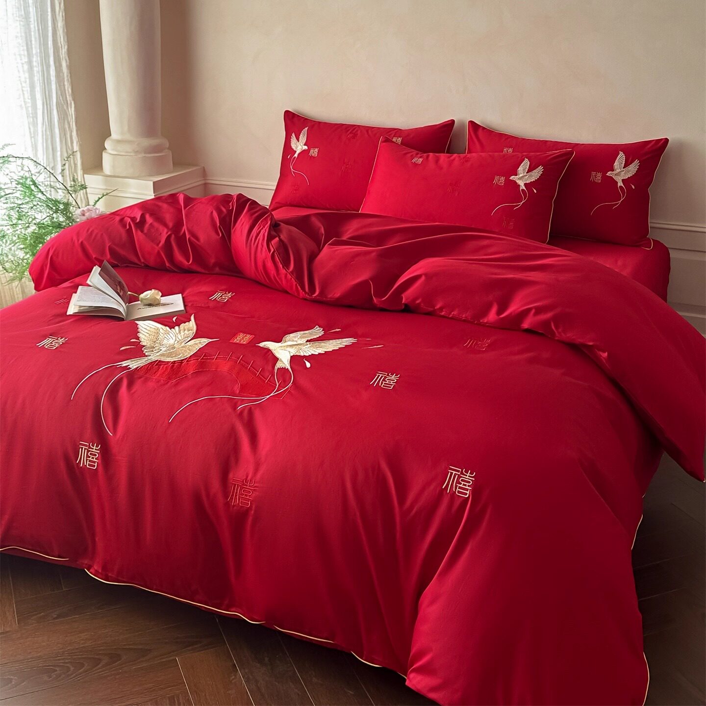 简约100支婚庆四件套红色双喜刺绣被套纯棉喜被床单结婚床上用品4