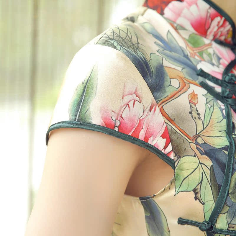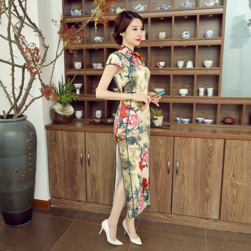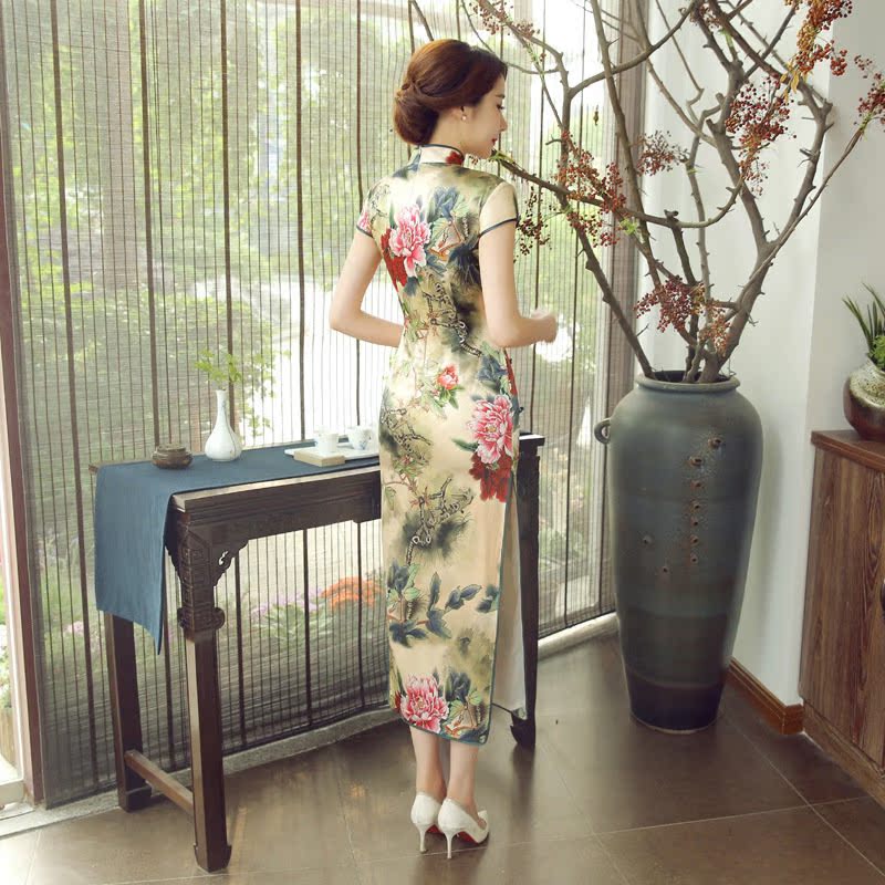 厂家直销旗袍长款修身真丝桑蚕丝改良时尚旗袍复古印花CZ0013