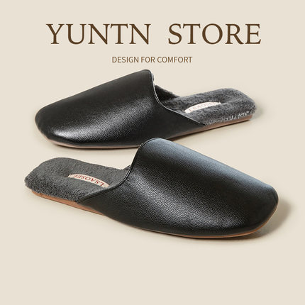 秋冬季轻奢气质高级感保暖防水PU皮棉拖鞋女情侣家用牛筋底居家男