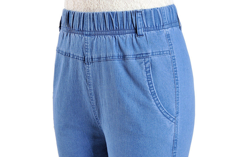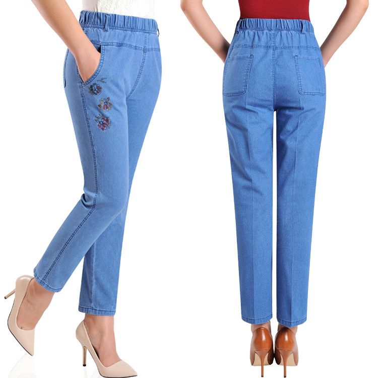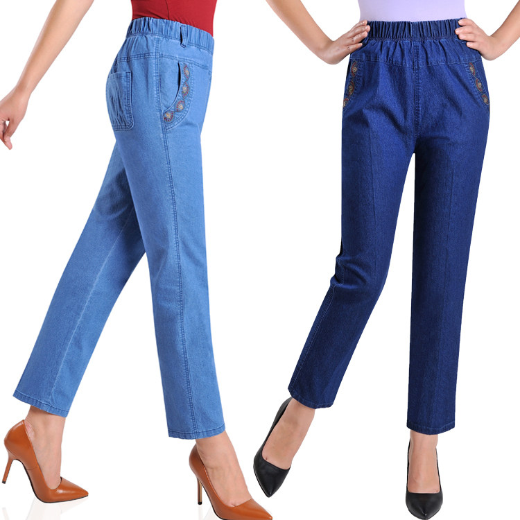 中年松紧腰九分牛仔裤女薄款大码棉弹力休闲裤高腰修身直筒妈妈裤