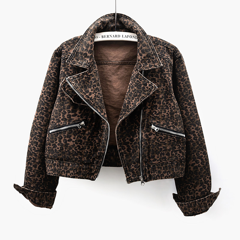 2025春季新款牛仔外套女短款豹纹印花休闲帅气拉链夹克开衫上衣潮