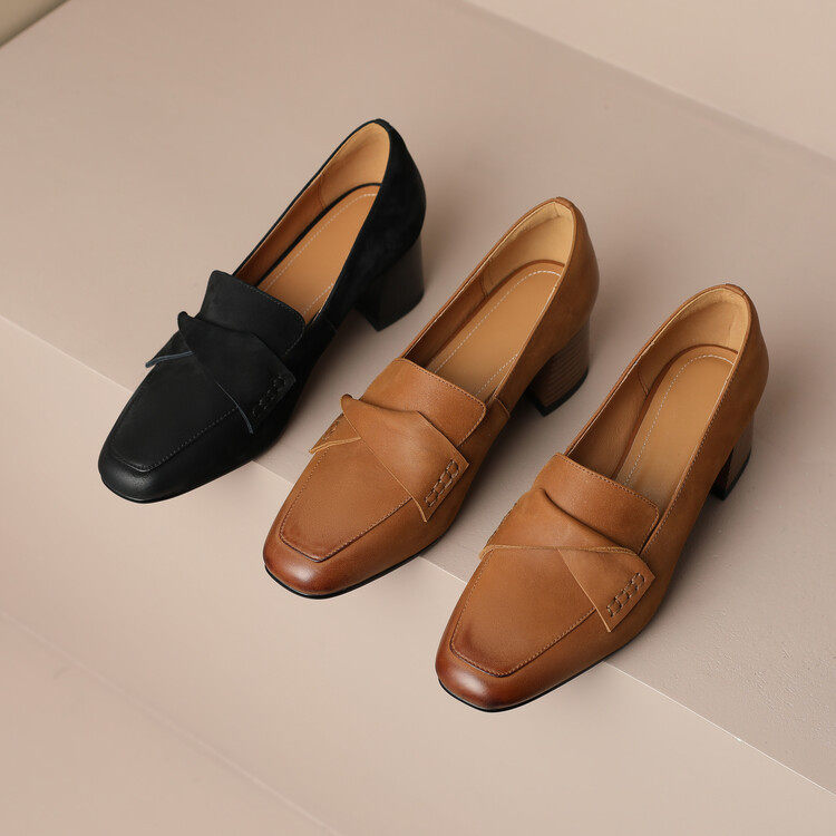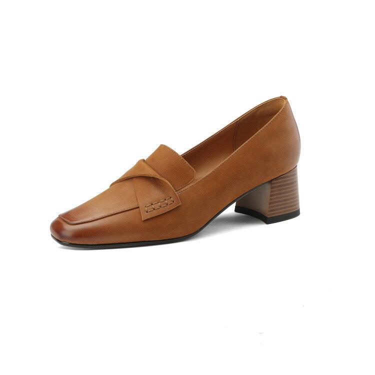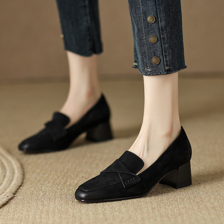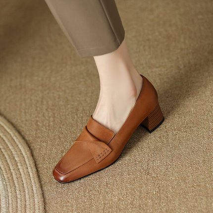 2023春季浅口轻奢牛皮时尚单鞋圆头粗跟中跟纯色舒适日常休闲女鞋