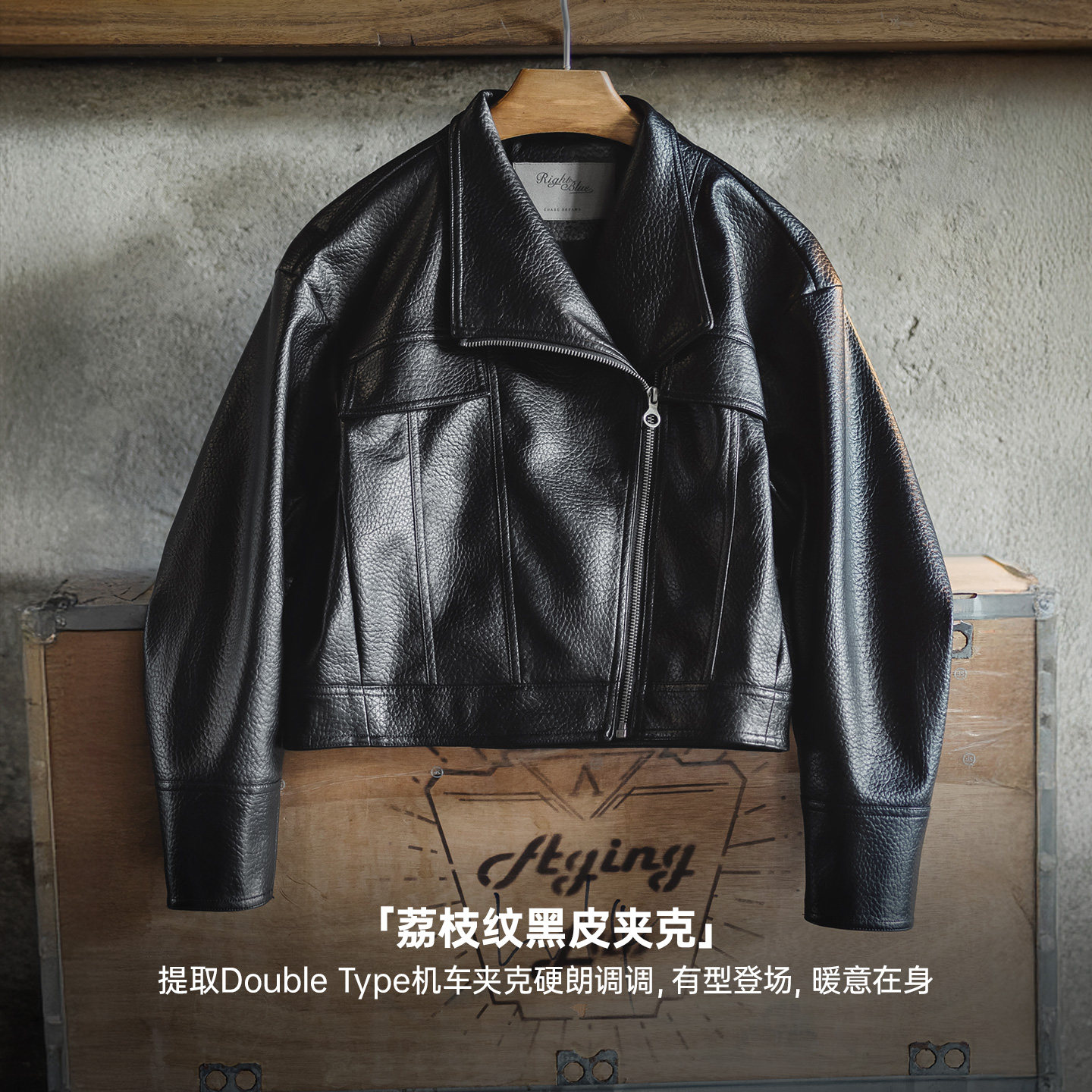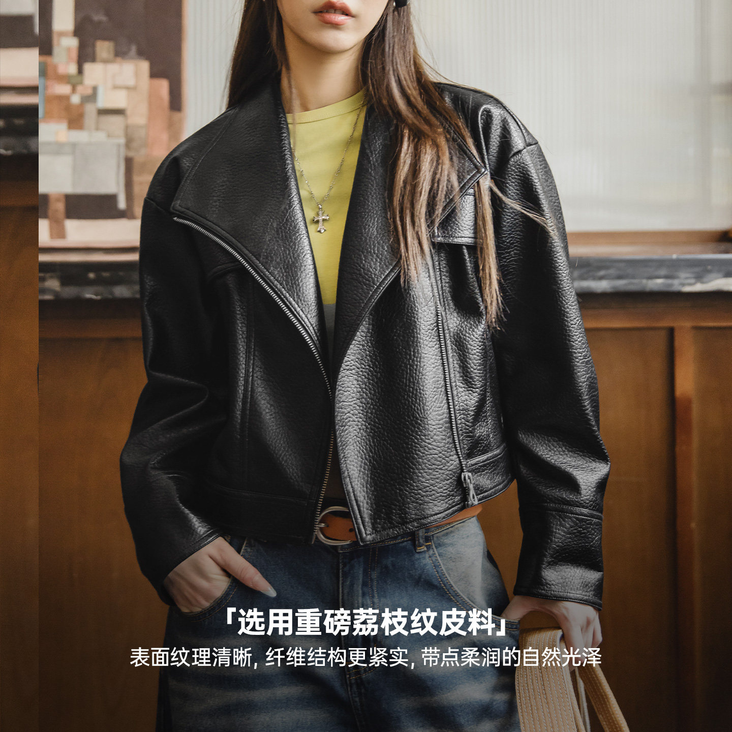 马登美式荔枝纹黑色短款斜拉链立翻领机车服PU皮衣夹克外套女士秋