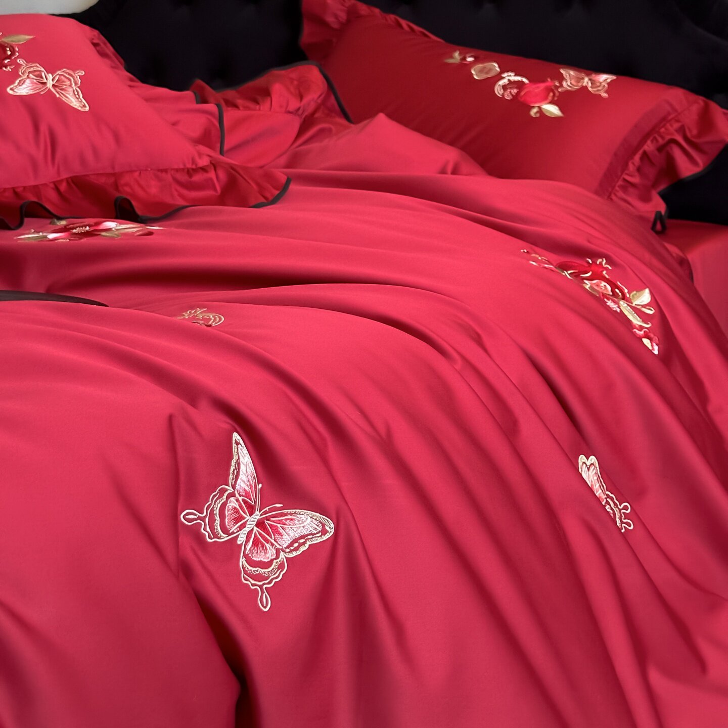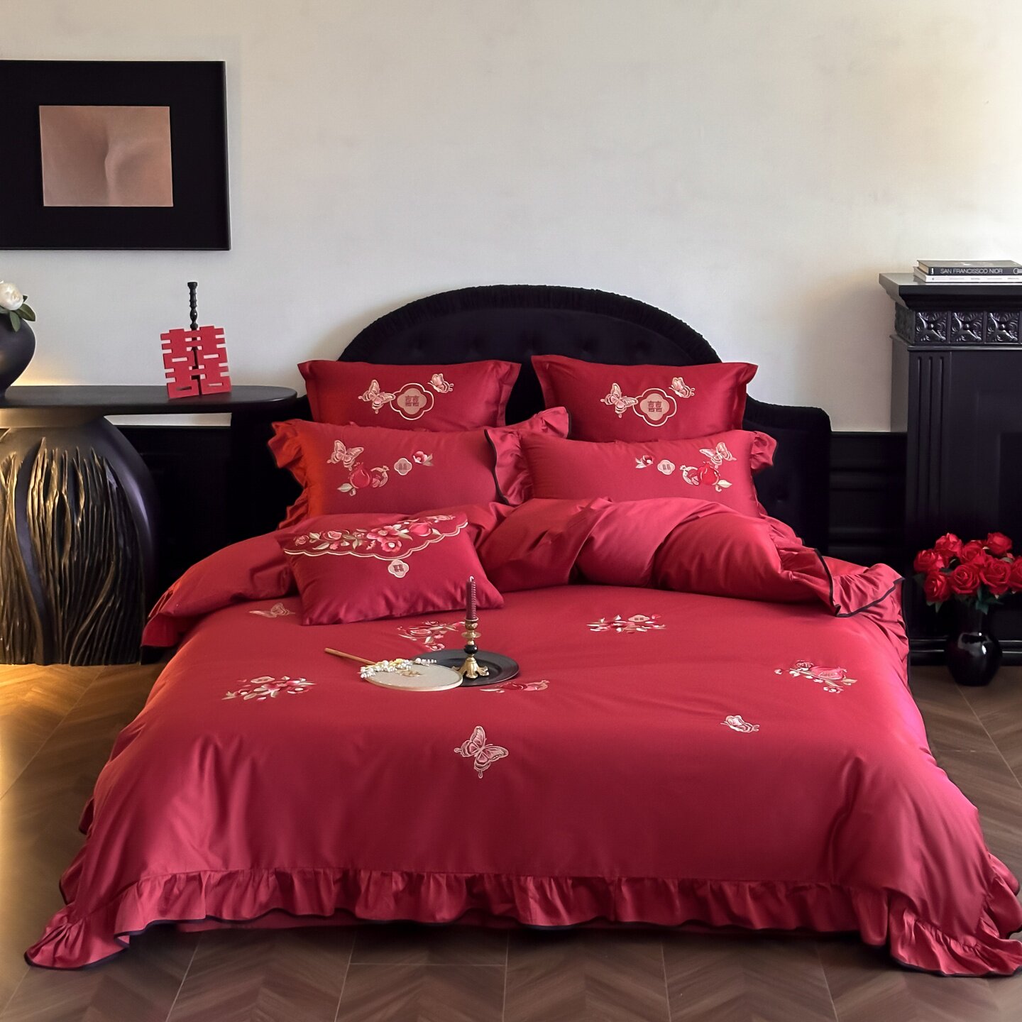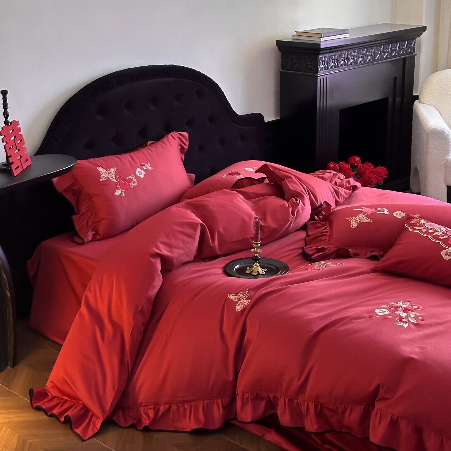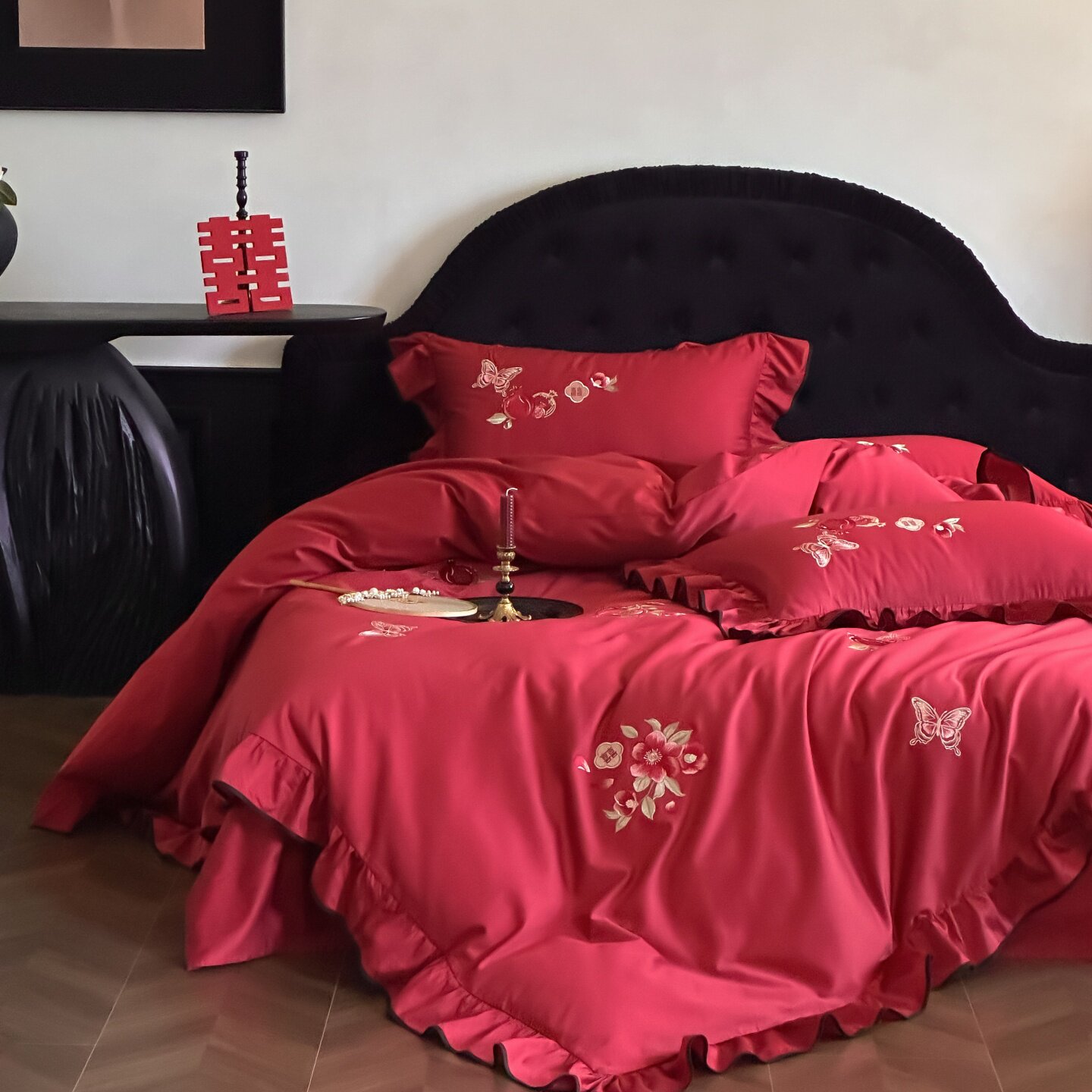 长绒棉婚庆红色荷叶边四件套