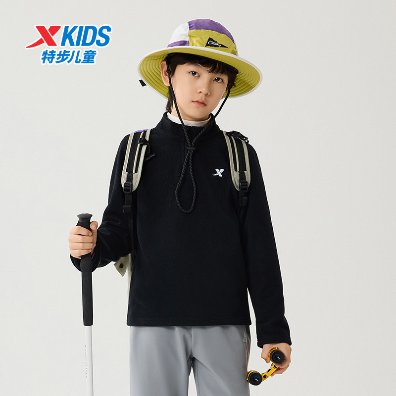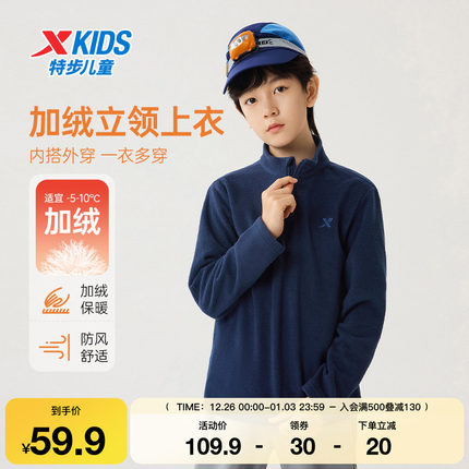 特步童装春秋季款中大童纯色立领儿童上衣男女童加绒保暖套头卫衣