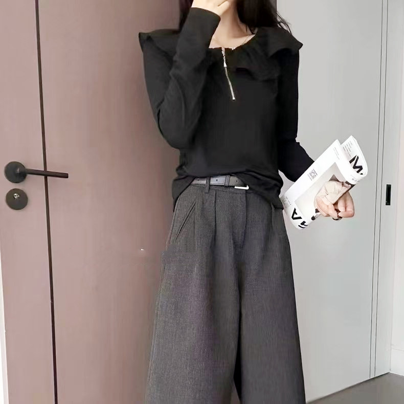 欧货洋气女装气质荷叶边领拉链弹力长袖T恤上衣小衫打底衫大码潮