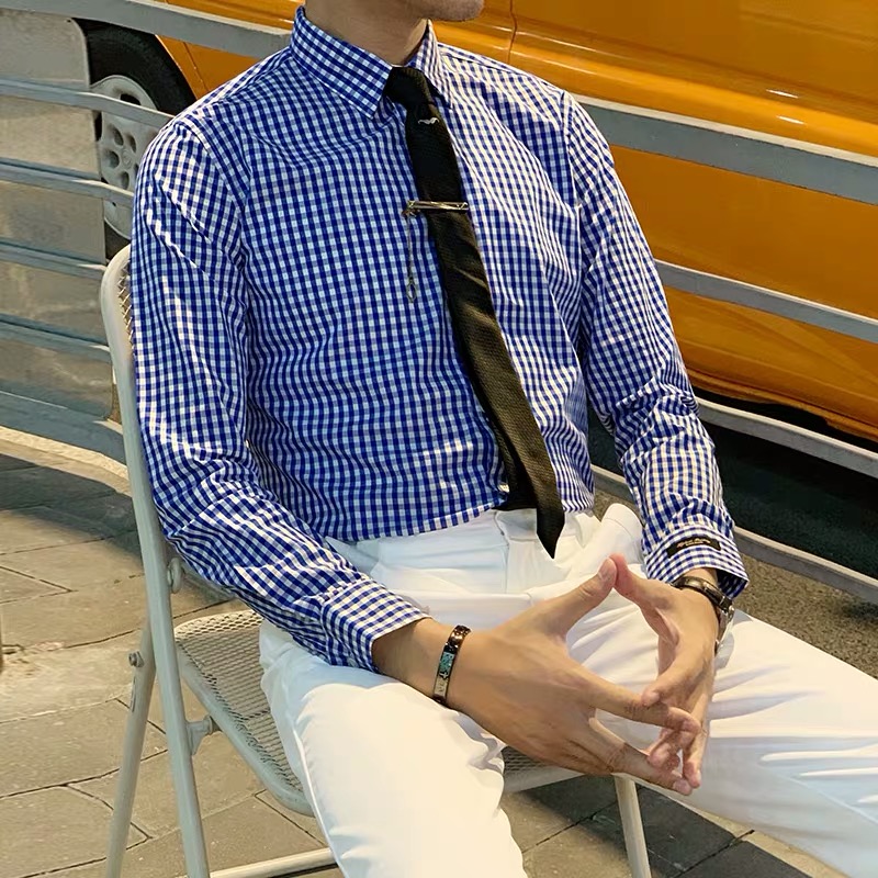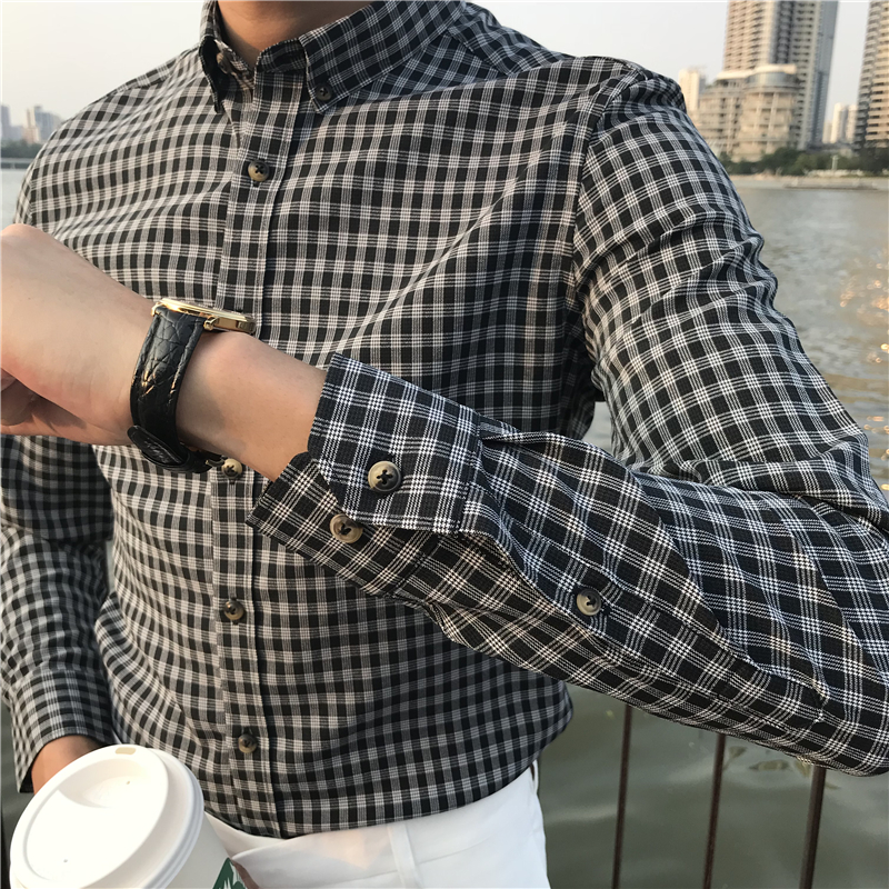 ins风千鸟格韩版修身复古男青年衬衣百搭英伦风格子潮男士衬衫