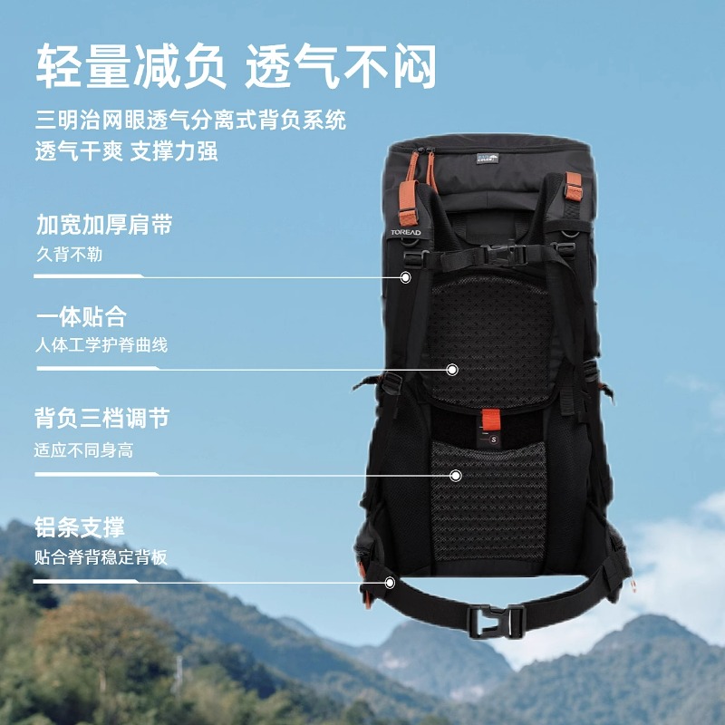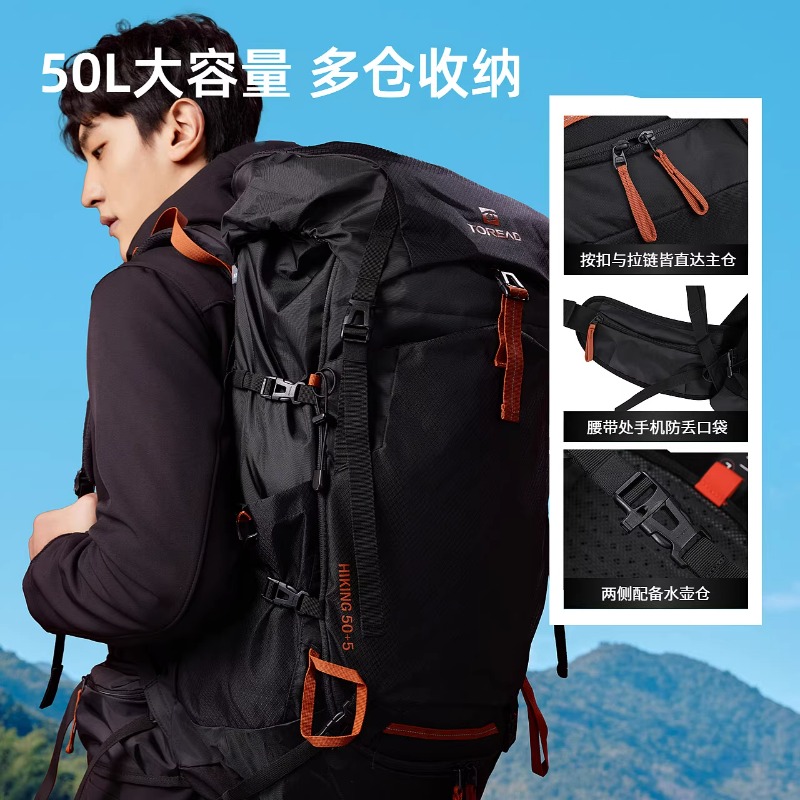 探路者户外双肩背包专业重装登山包50升大容量轻便黑色徒步露营包