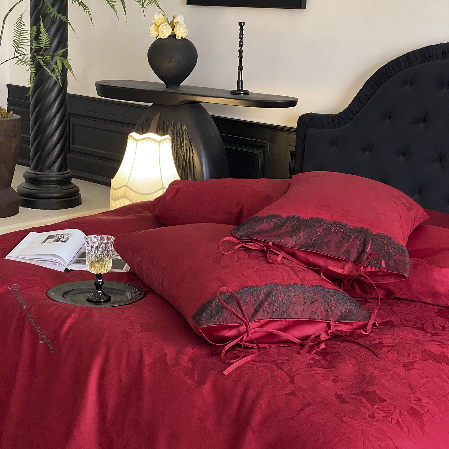 浪漫蕾丝边100S全棉婚庆四件套红色提花刺绣被套床单结婚床上用品