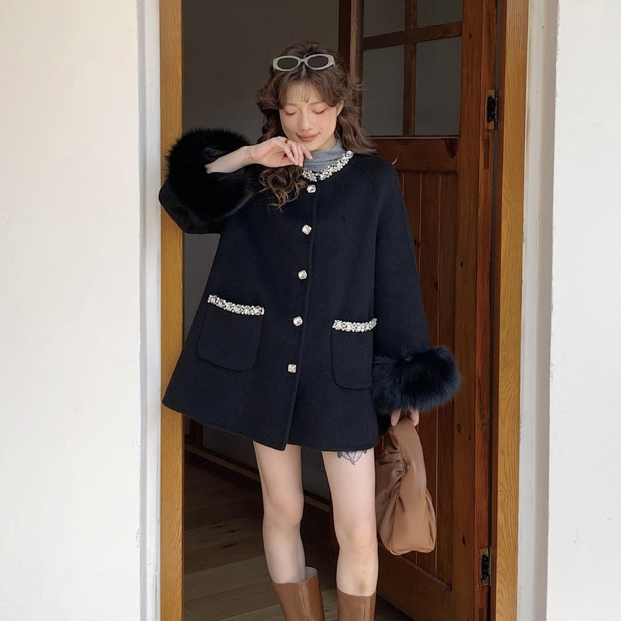 欧洲站2025新款韩系钉珠双面羊毛大衣狐狸毛皮草外套女圆领中长款