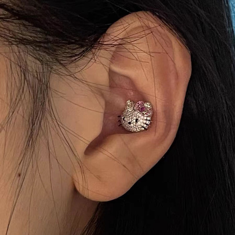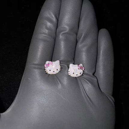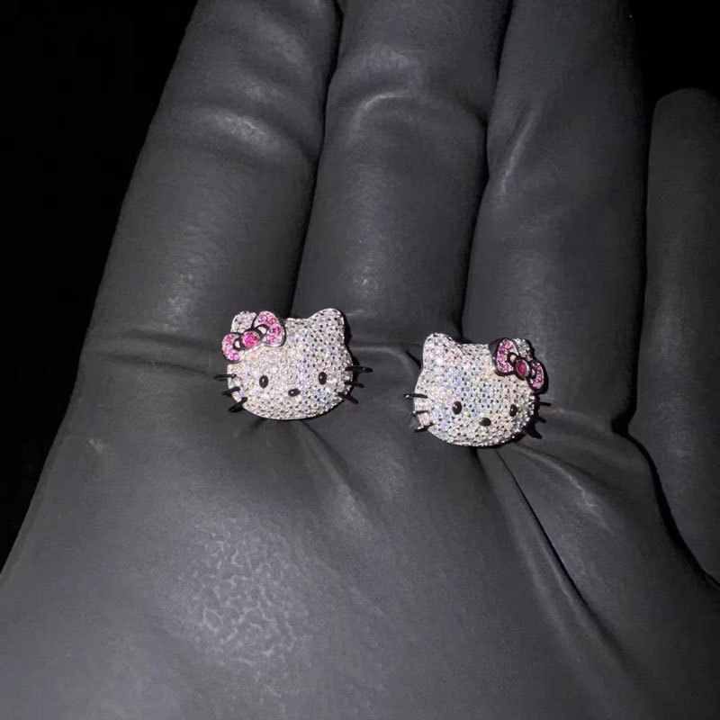 新款个性粉色卡通Kitty猫镶满钻耳钉女可爱闪闪独特气质百搭耳饰