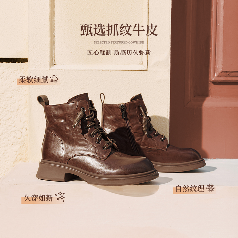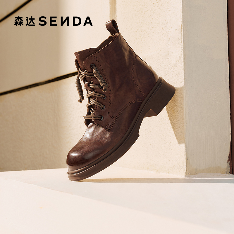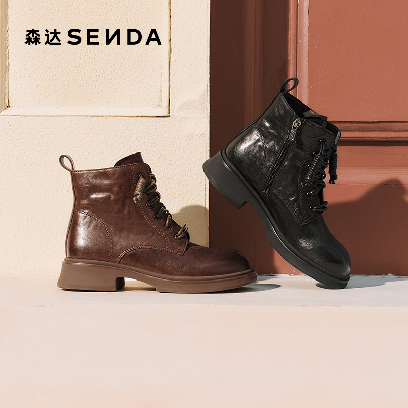森达马丁靴女25冬新商场同款真皮抓皱机车风厚底休闲短靴XTS01DD5