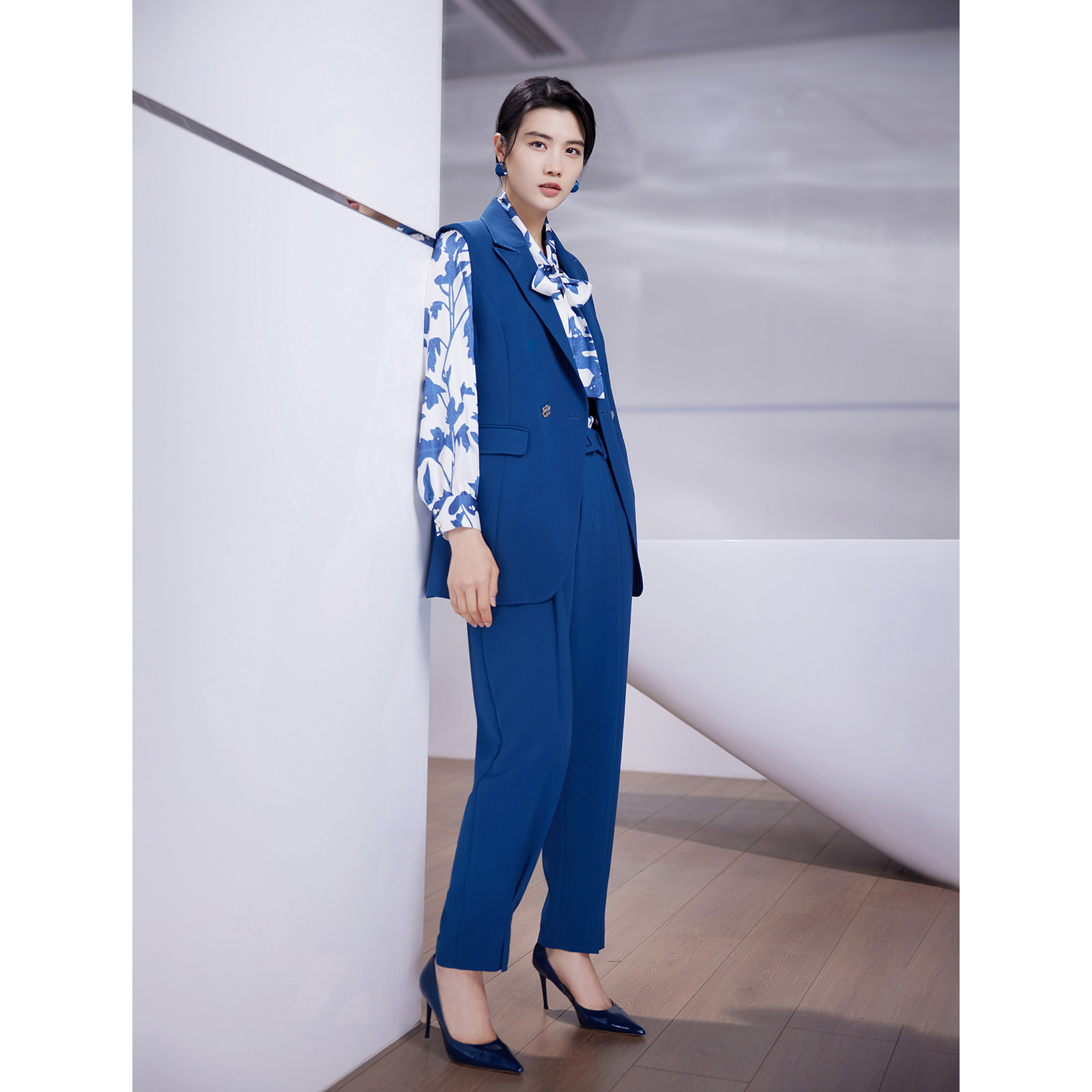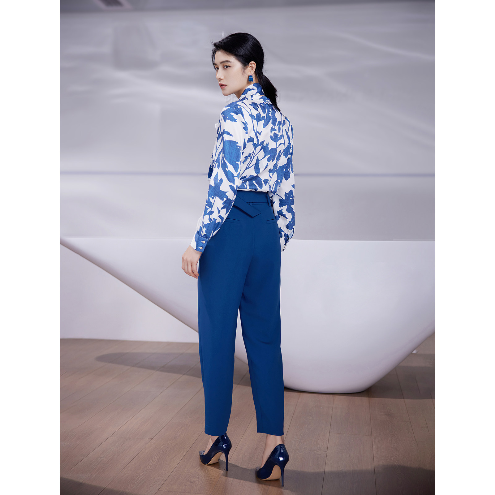 【商场同款】BBLLUUEE/粉蓝衣橱秋冬时尚抽褶蓝色肌理感小脚裤女
