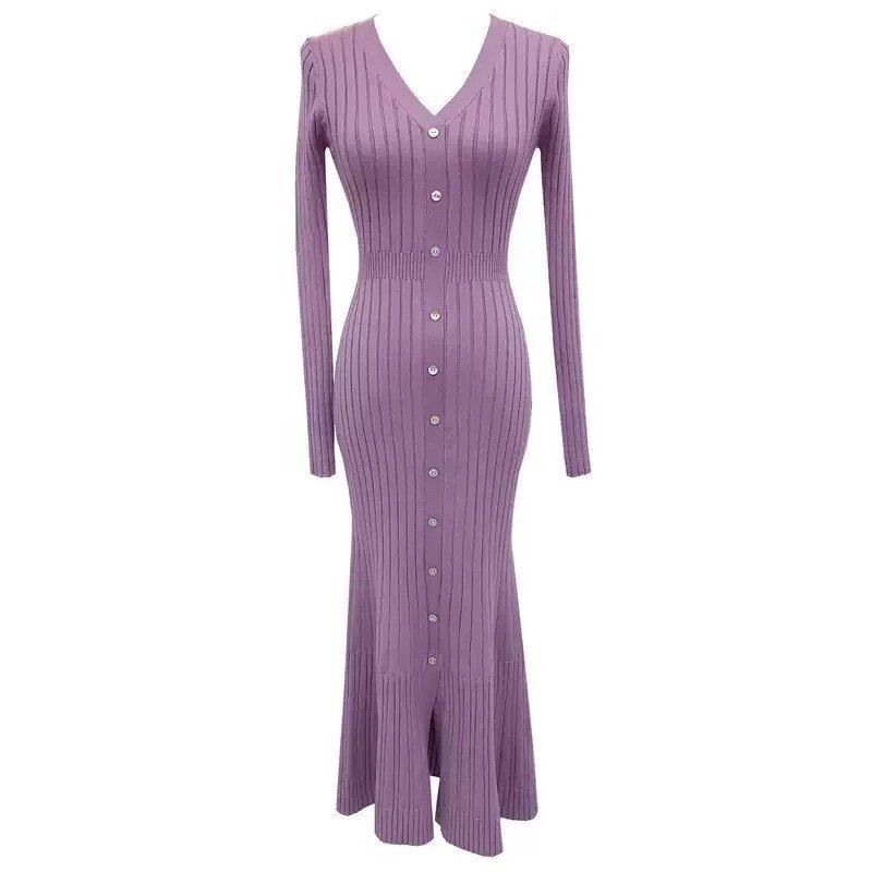 纯欲收腰紫色V领针织连衣裙女2025冬季内搭修身性感包臀鱼尾长裙