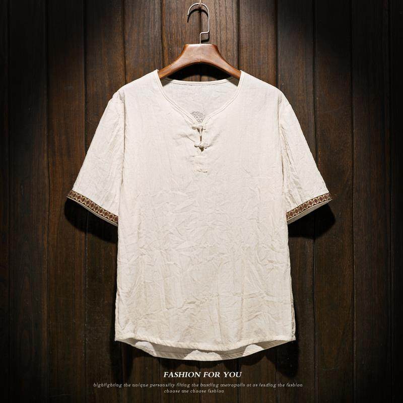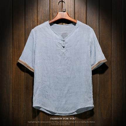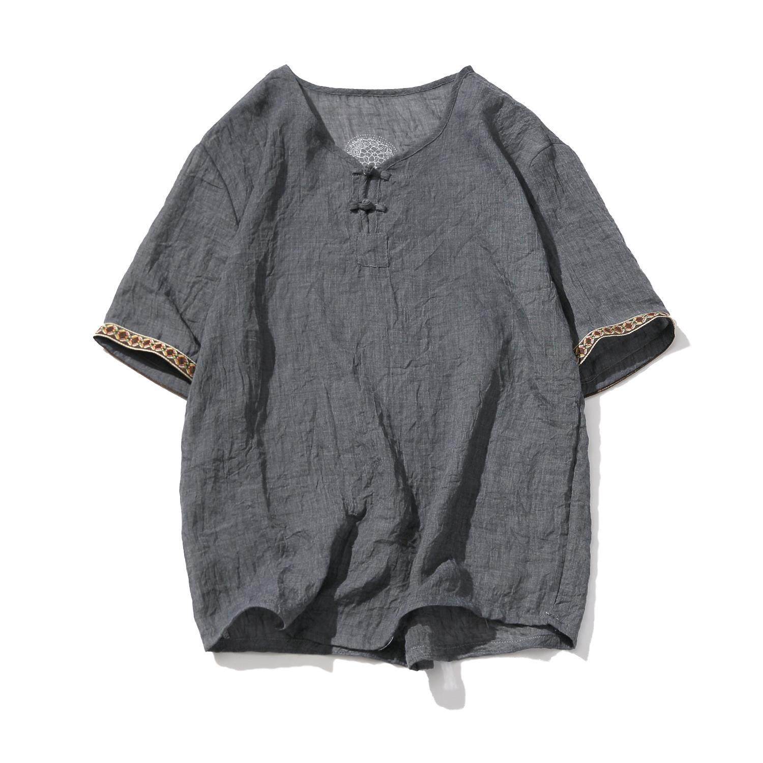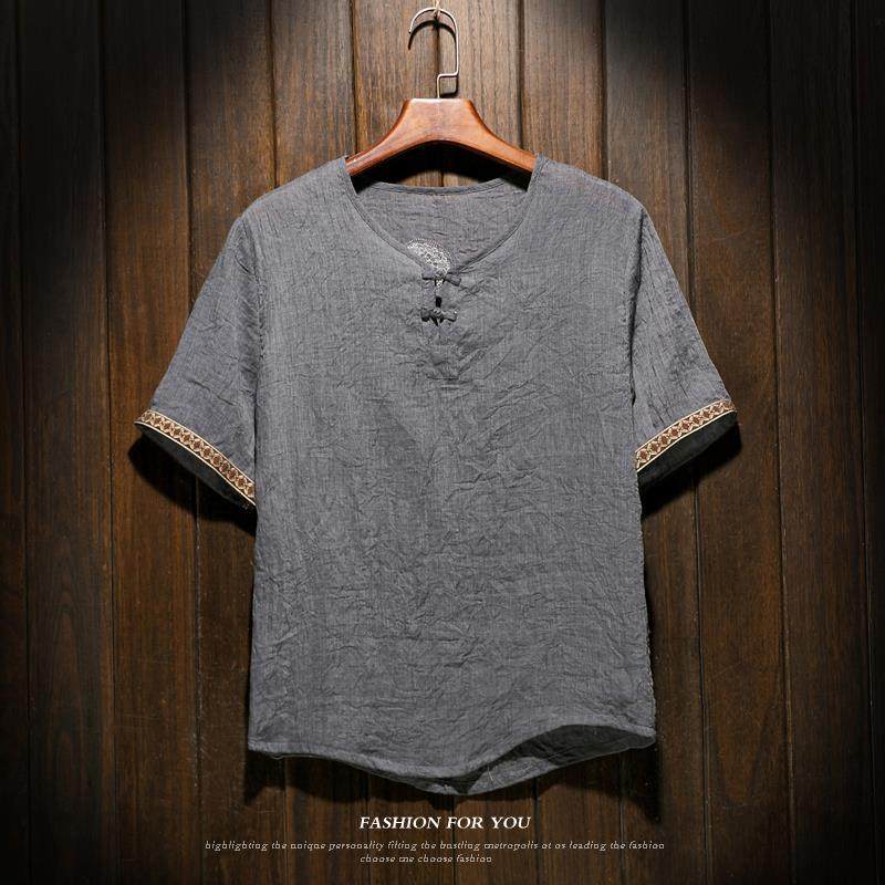 中国风男装亚麻T恤男士短袖宽松大码棉麻衣中式麻料盘扣上衣服
