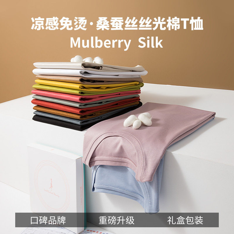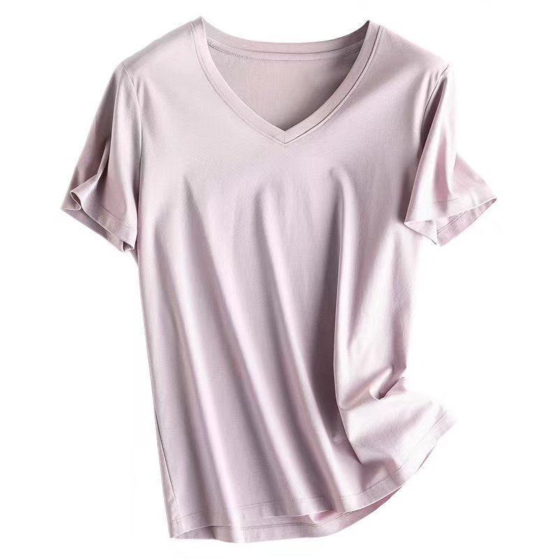 桑蚕丝丝光棉短袖T恤女宽松套头夏纯色圆V领百搭外穿打底衫上衣