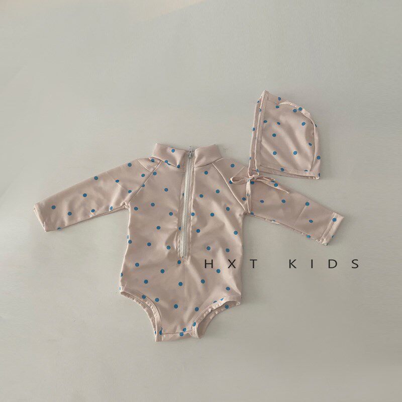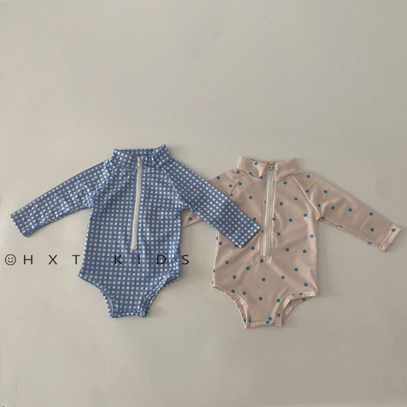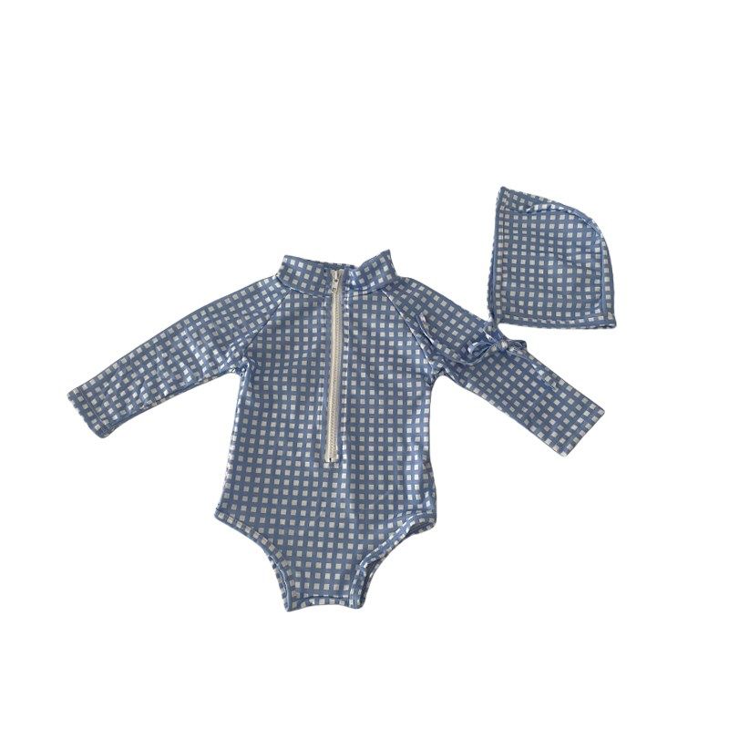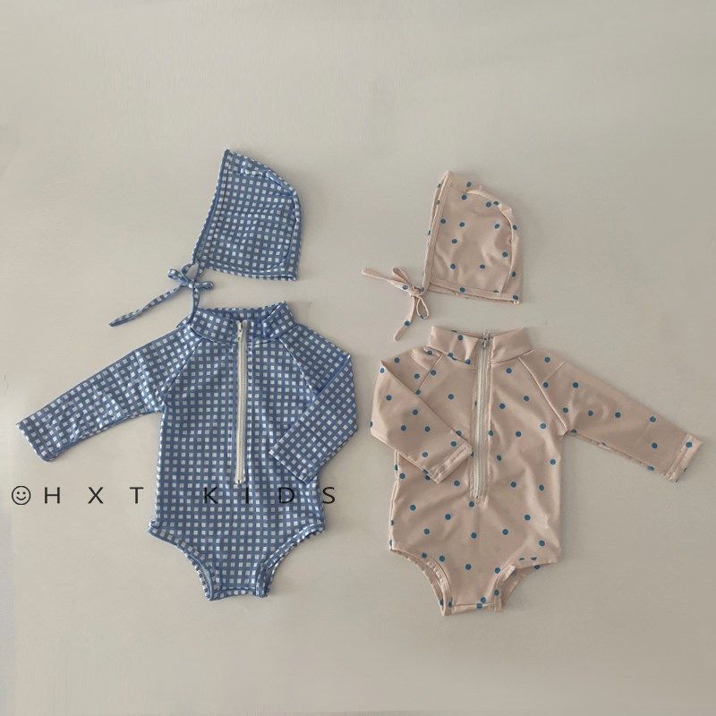 儿童夏季出游游泳二件套洋气格子波点婴儿宝宝包屁泳衣泳帽套装潮