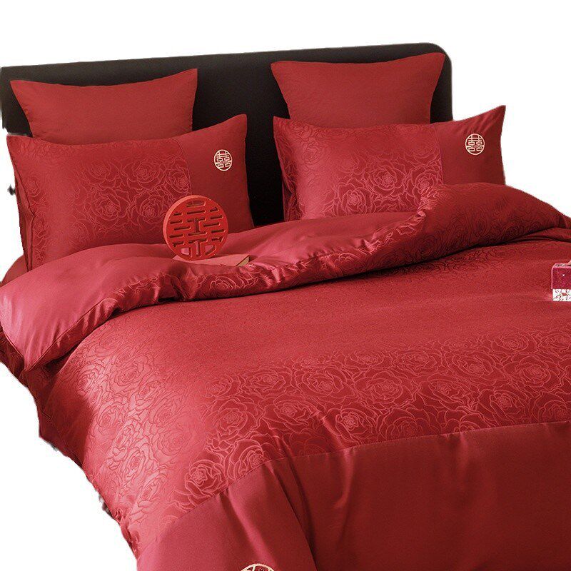 中式喜字结婚四件套大红色床单玫瑰提花被套婚庆婚房喜被床上用品