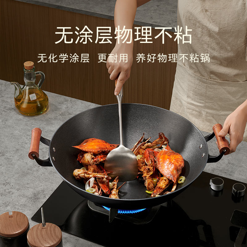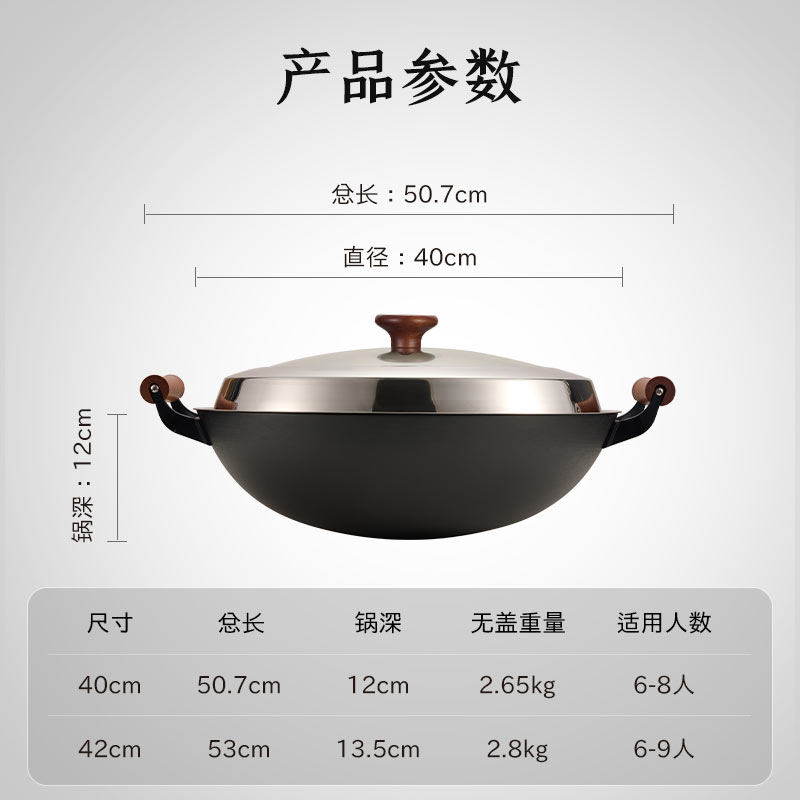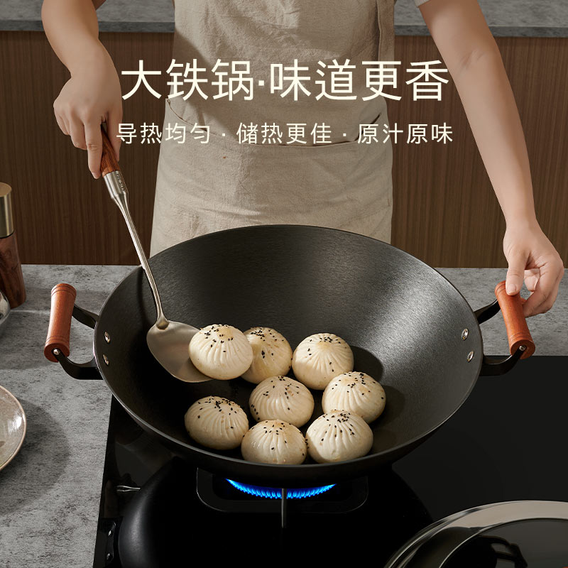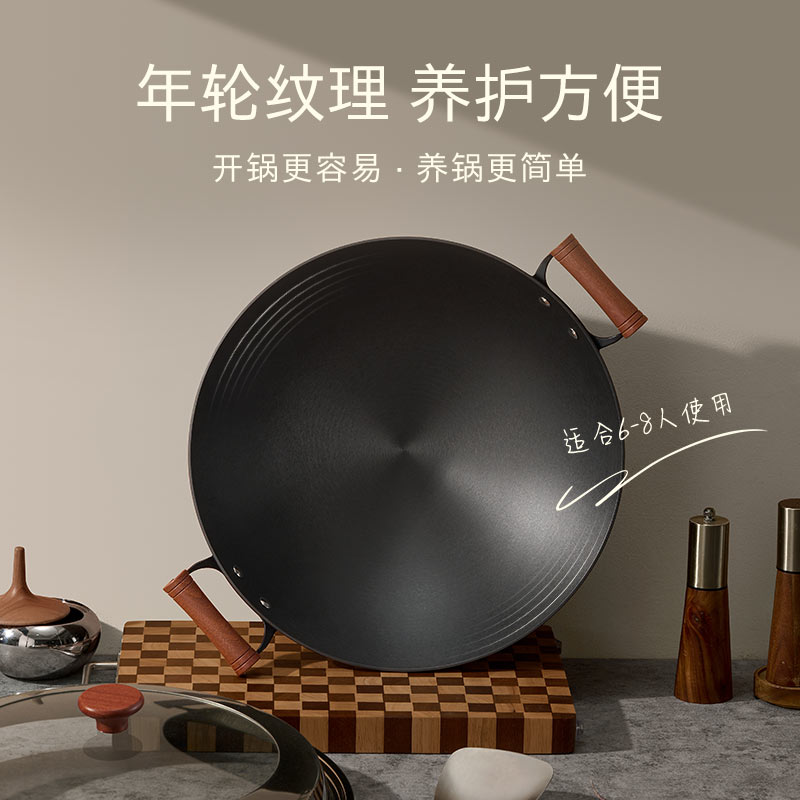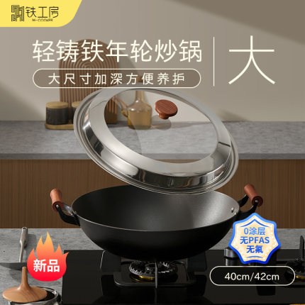 铁工房双耳大铁锅炒锅家用圆底无涂层铸铁锅年轮系列40/42cm燃气