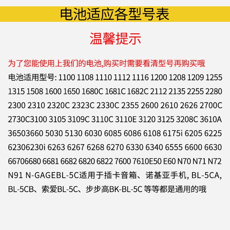 适用BL-5C诺基亚手机锂电池2610 bl5c插卡3.7V小音箱响1110收音机3100 5CA原裝-5CB 5130 1600 3650 N70 N72