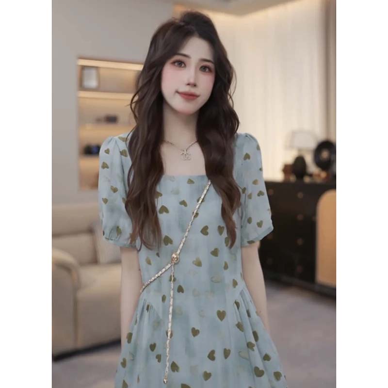 送发圈夏季新款方领显瘦中长款时尚设计感高腰短袖连衣裙D2942