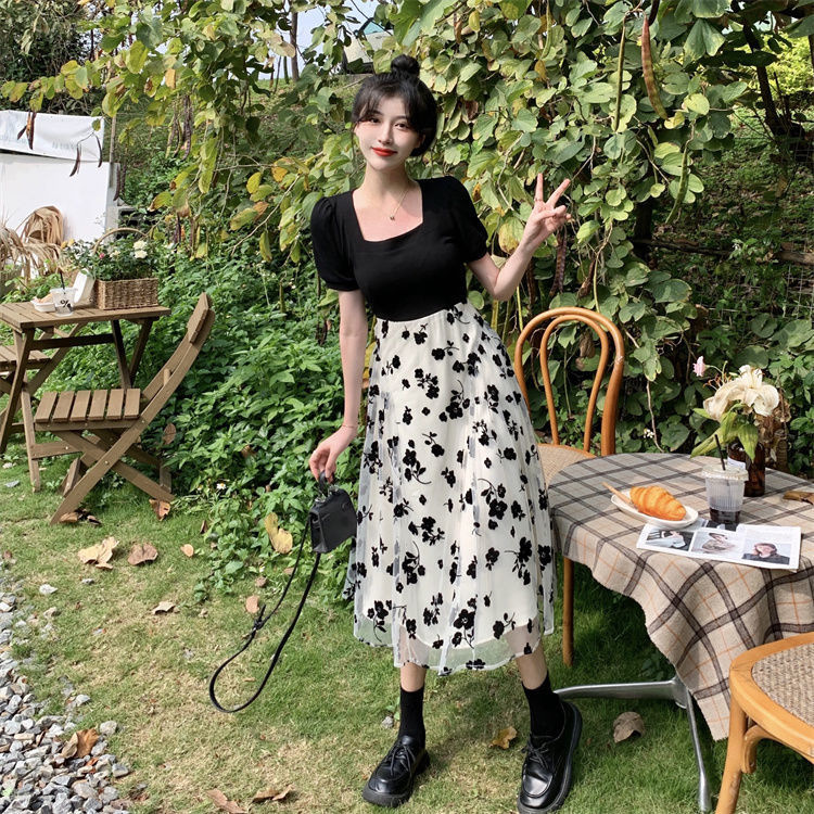 假两件碎花连衣裙女夏季2025新款收腰显瘦初恋气质修身方领A字裙