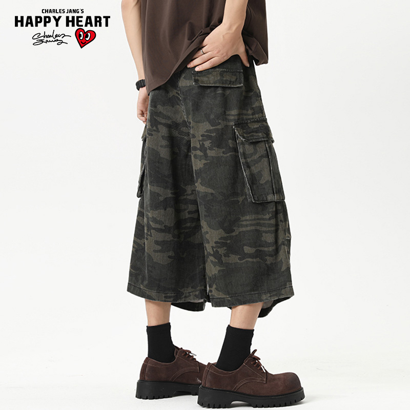 查尔斯桃心 迷彩水洗工装牛仔七分裤男女2025年夏季过膝休闲短裤