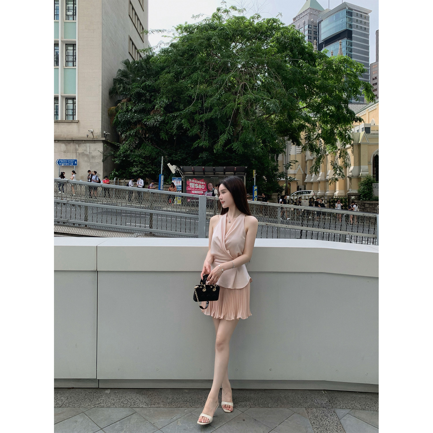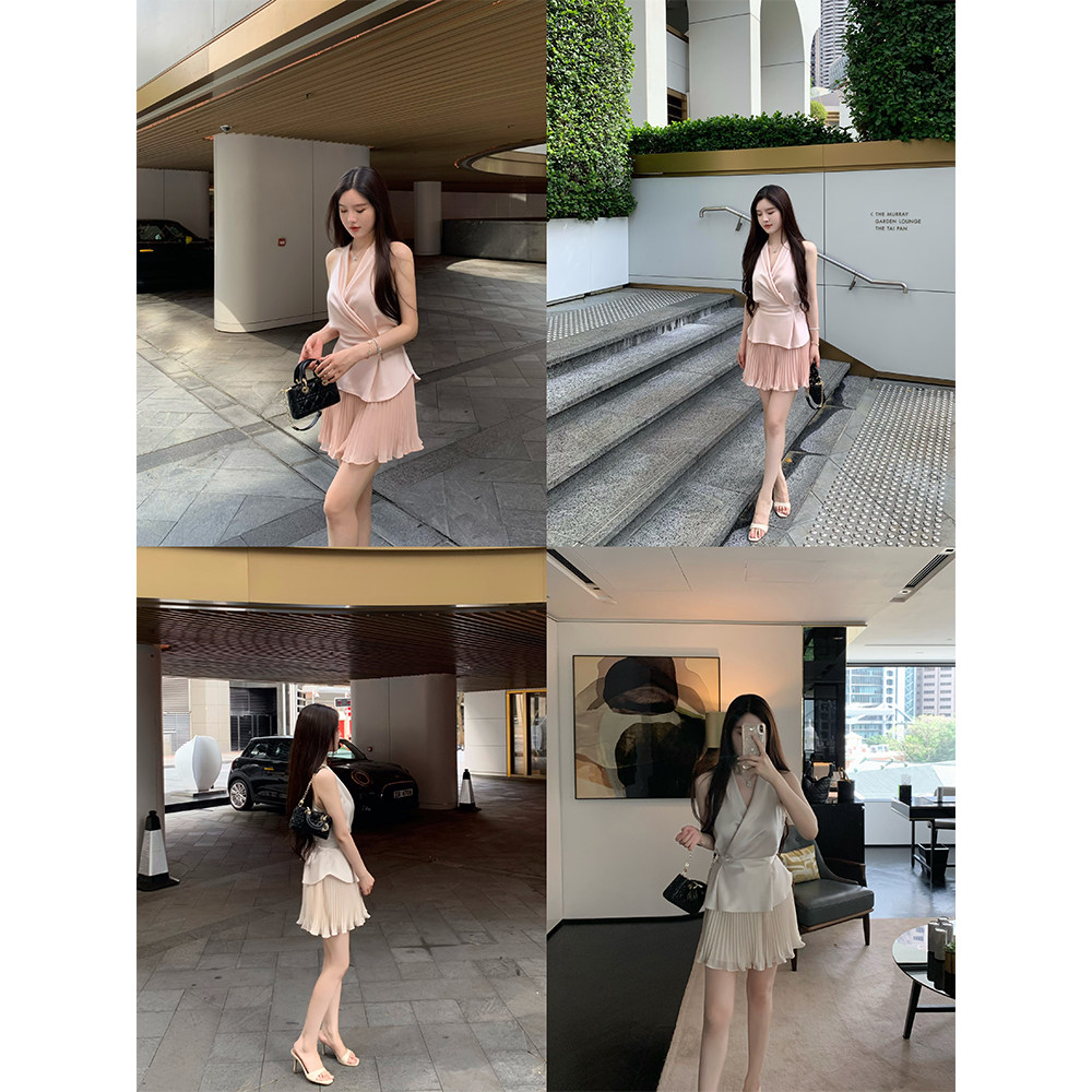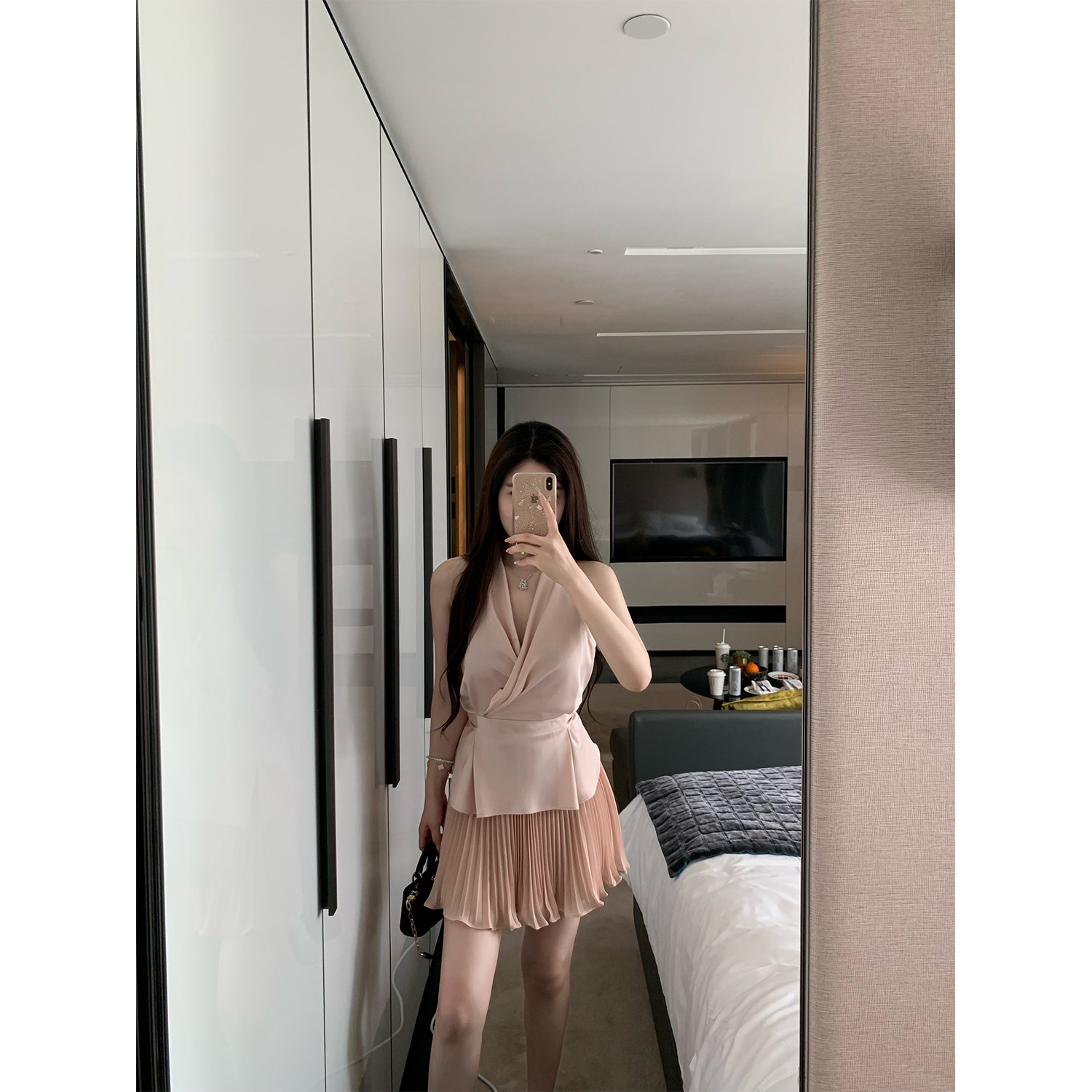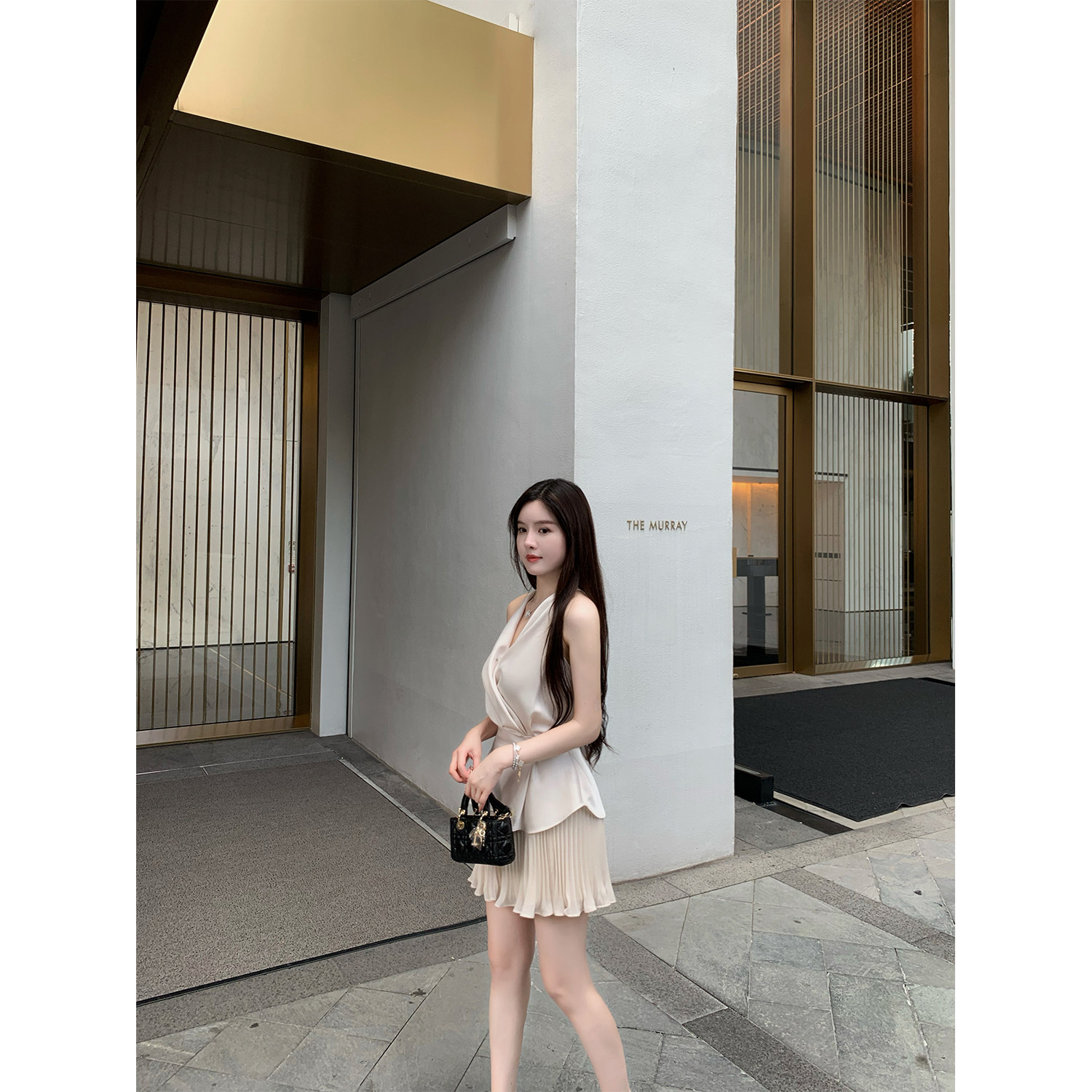 THE SWAN司凰轻奢 娇贵姐姐 交叠v领缎面绑带无袖上衣/雪纺百褶裙