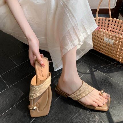 法式度假风方头夹趾凉鞋女2026夏季编织露趾平底低跟一字拖鞋女