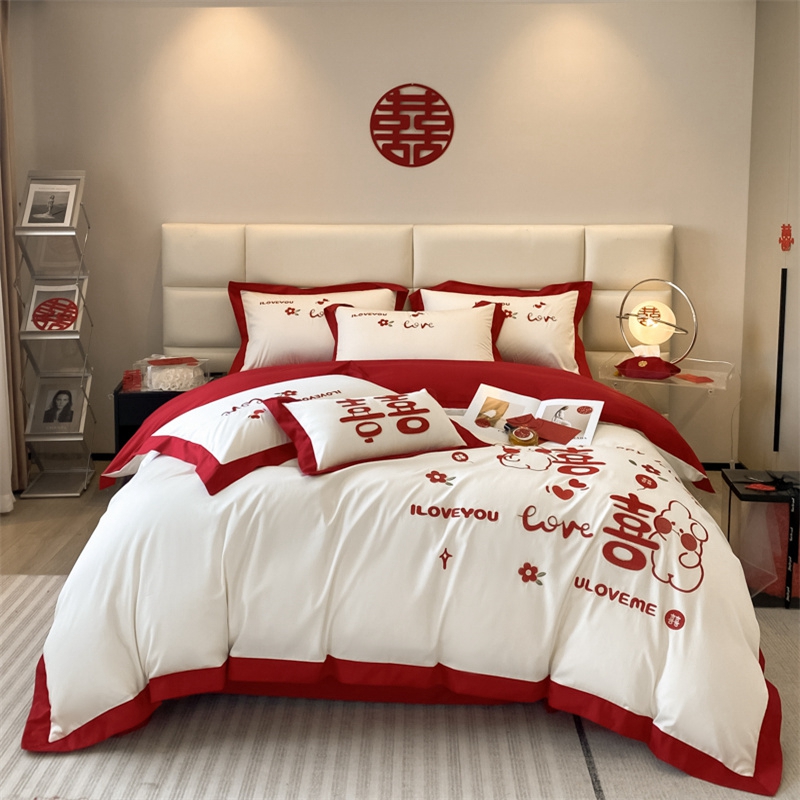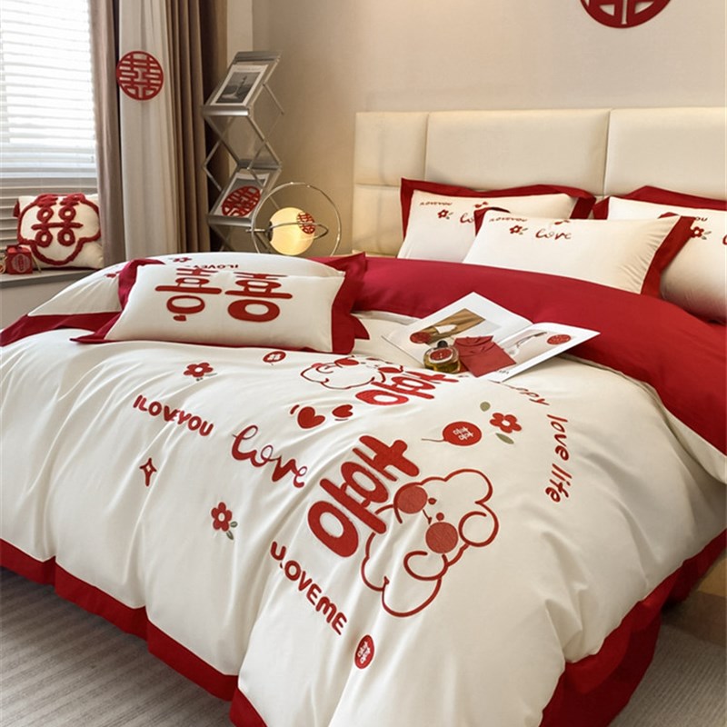可爱全棉兔年结婚四件套婚床上用品红色刺绣被套婚庆喜被婚嫁