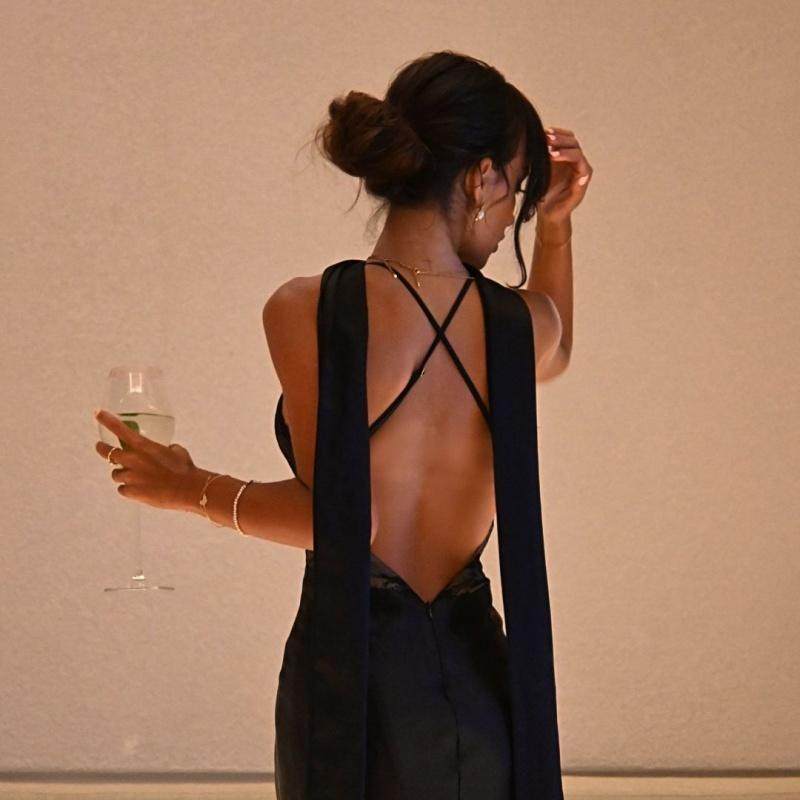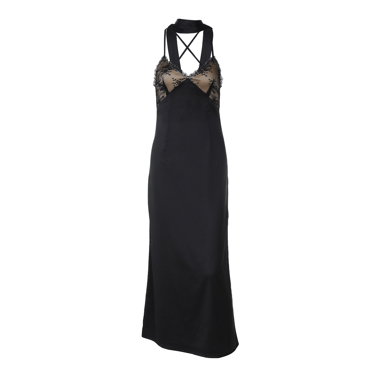 氛围感蕾丝拼接V领吊带长裙2026夏季新款辣妹修身露背飘带连衣裙