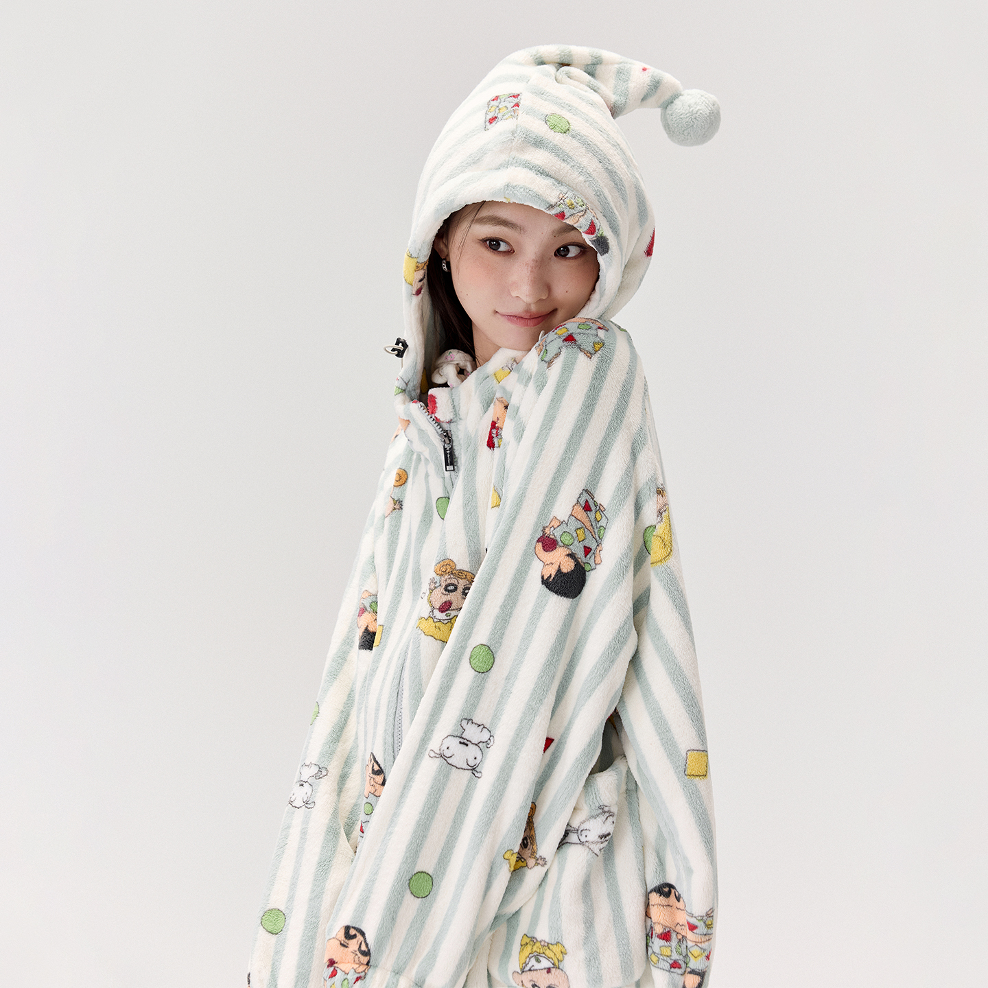亲嘴猫蜡笔小新连帽法兰绒套装女