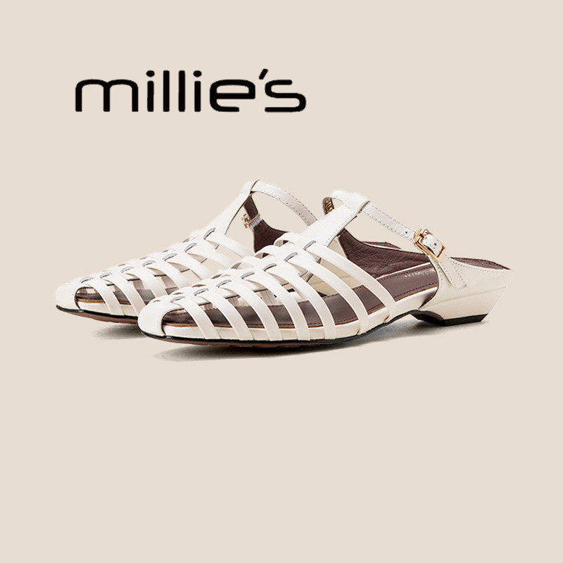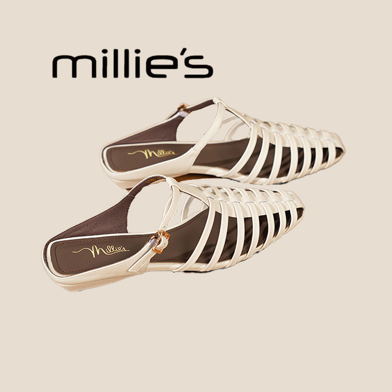MILLIE'S/妙丽2025夏季新款真皮镂空凉鞋女鞋平底罗马鞋包头半拖