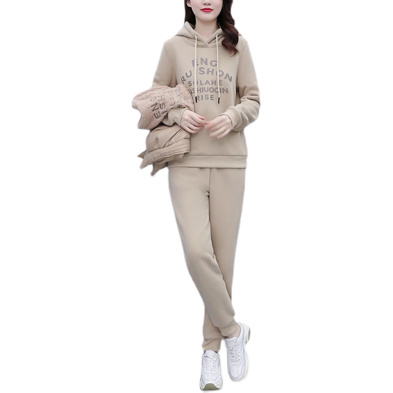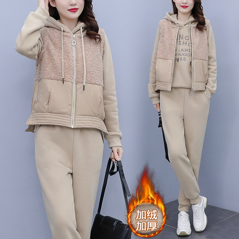 冬季加绒加厚卫衣马甲套装女保暖休闲百搭大码女装宽松外套三件套