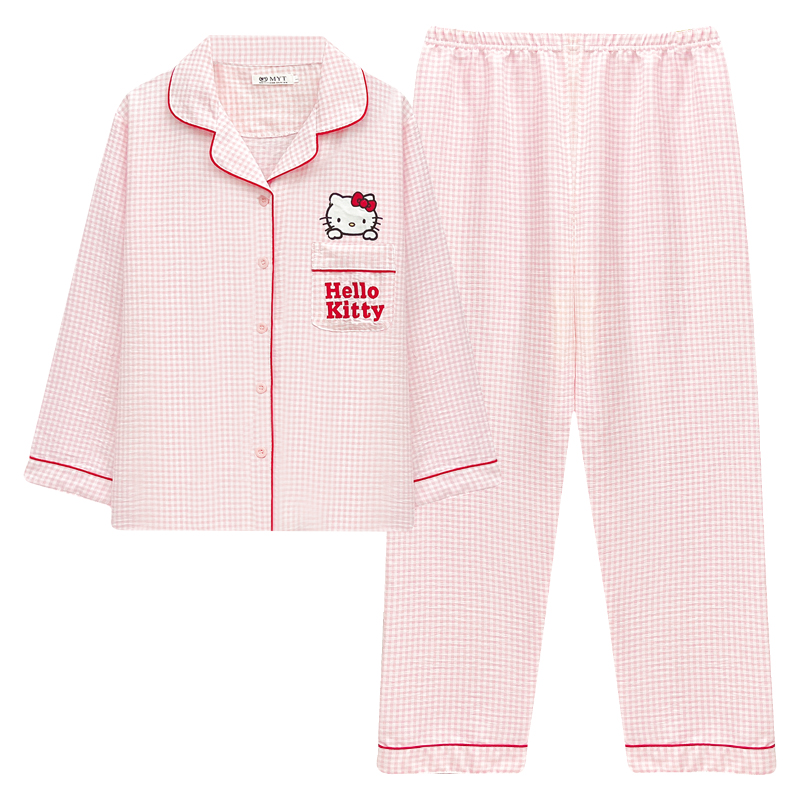 新款hellokitty睡衣女春秋季梳织纯棉纱长袖可爱卡通家居服套装薄