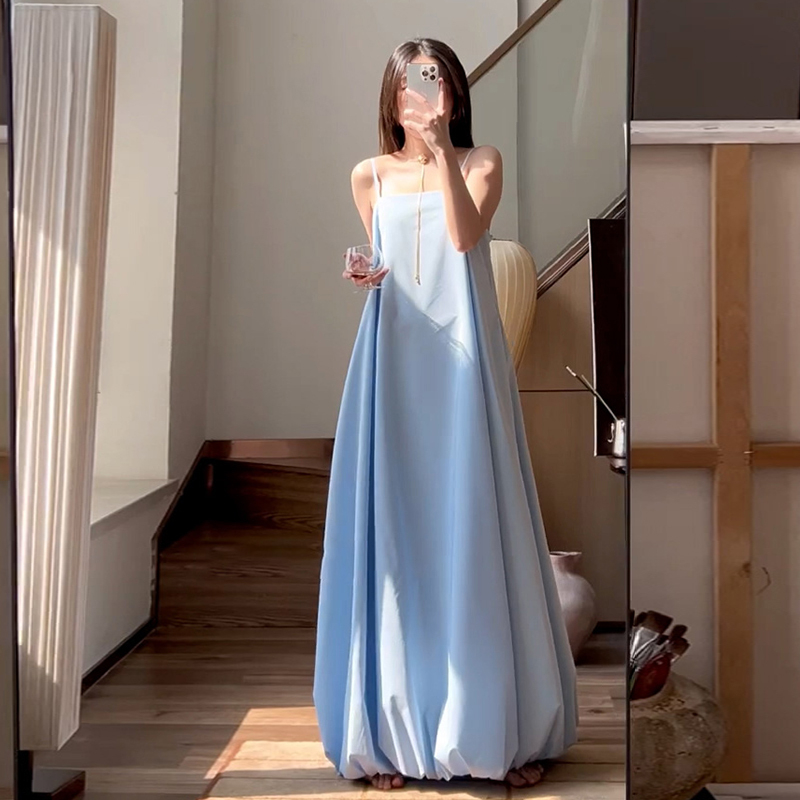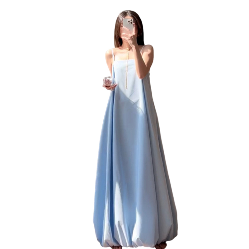 法式水母蓝吊带睡裙女夏款2025新款海边度假风露背性感气质花苞裙