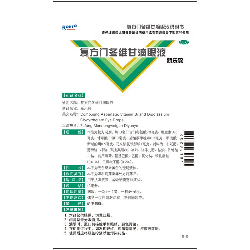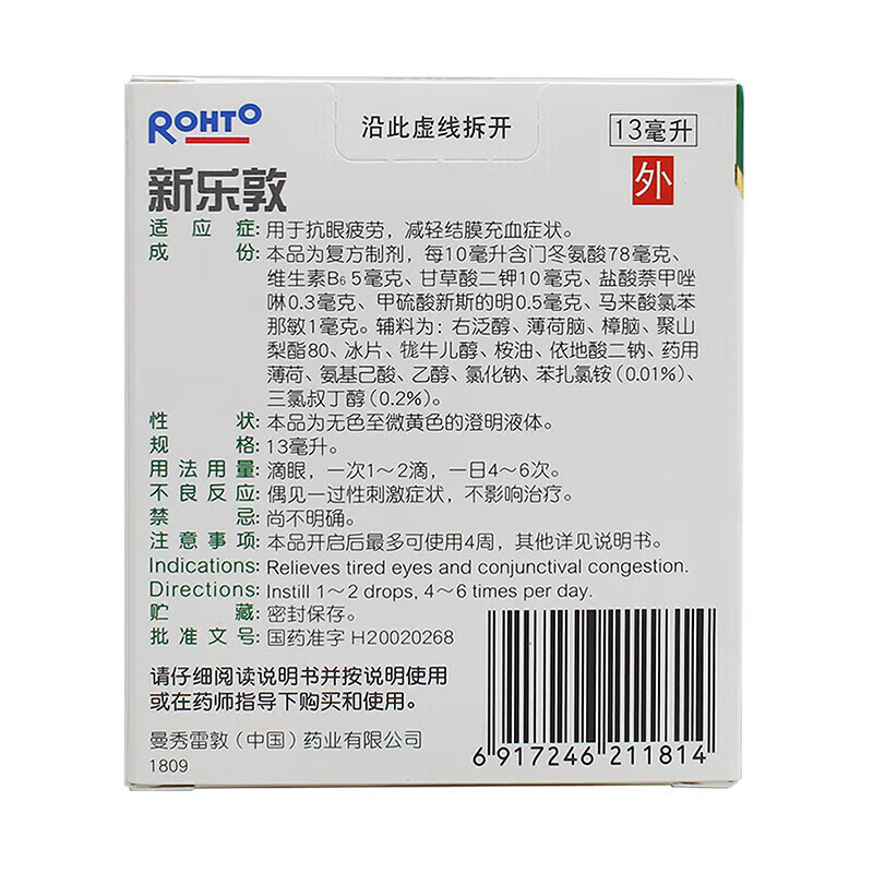新乐敦复方门冬维甘滴眼液13ml抗眼疲劳减轻结膜充血薄荷清凉滋润