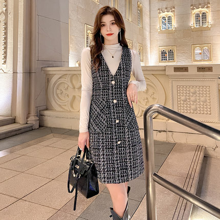名媛背心裙千鸟格修身秋冬毛呢裙