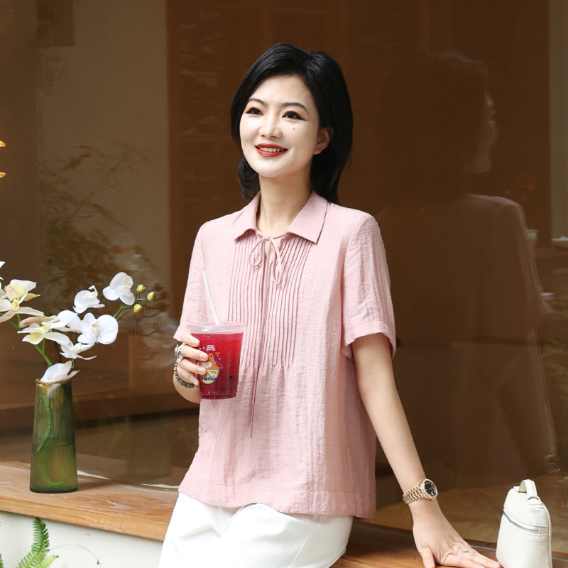 枫竺天丝宽松翻领蝴蝶结短袖衬衫女夏季2025新款粉色气质捏褶上衣