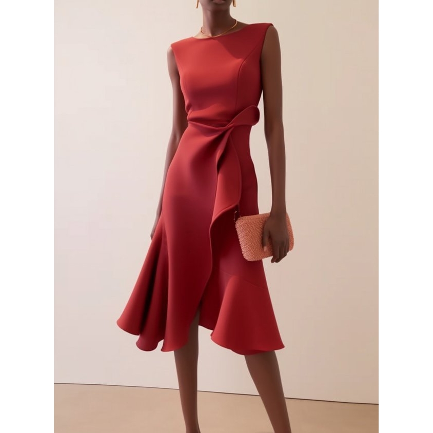 2025欧美女装 亚马逊 独立站 无袖 红色 气质 礼服 连衣裙 圆领