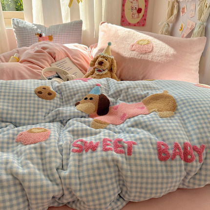 牛奶绒四件套ins卡通腊肠狗冬季