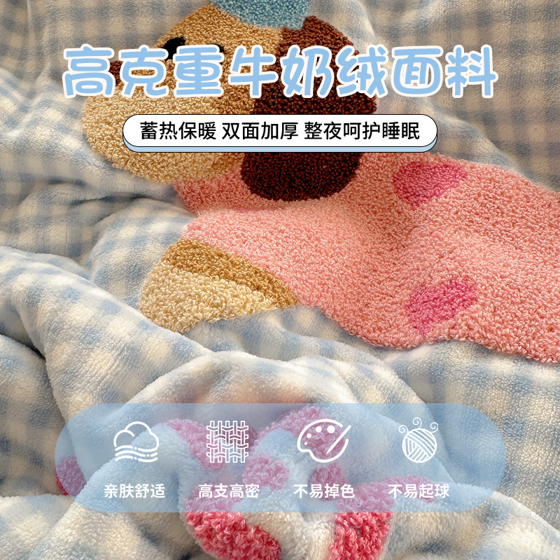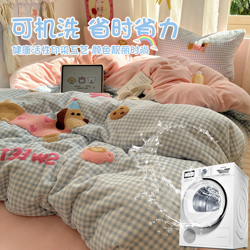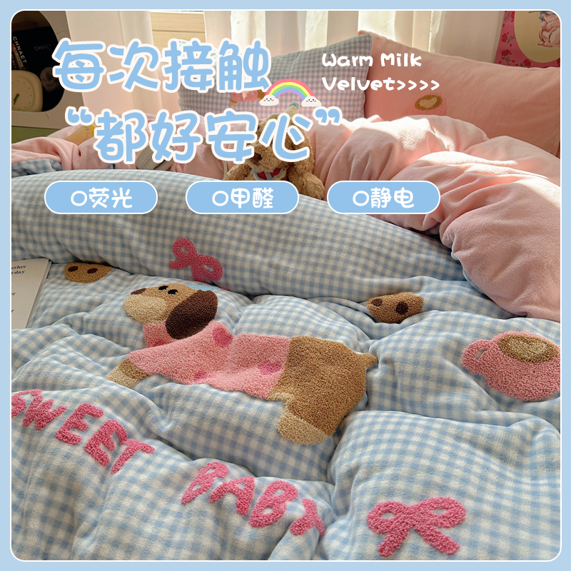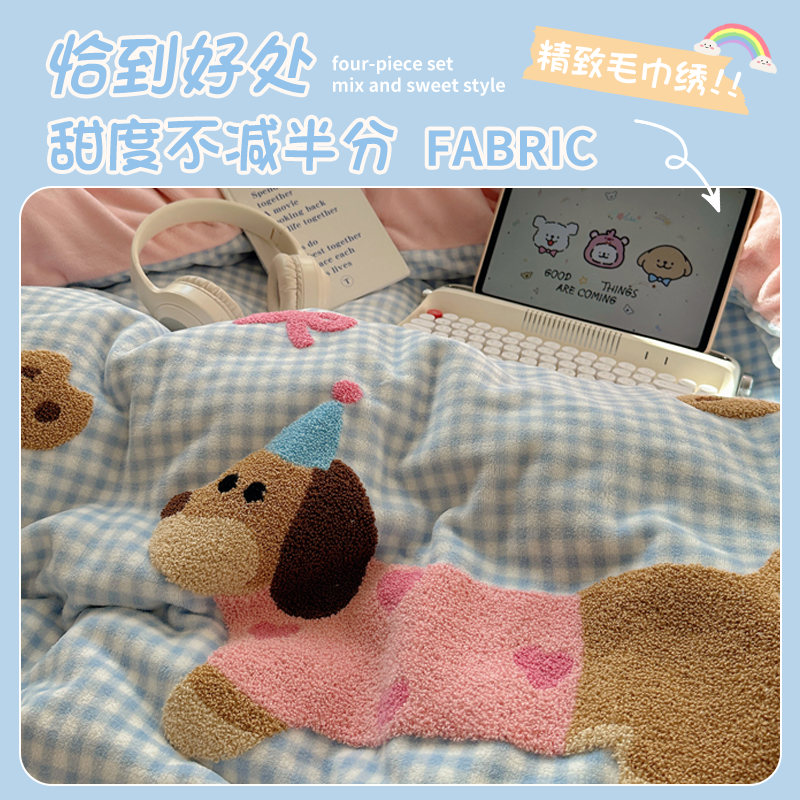 卡通可爱毛巾绣牛奶绒四件套2025新款冬季加厚珊瑚绒床单人被套三
