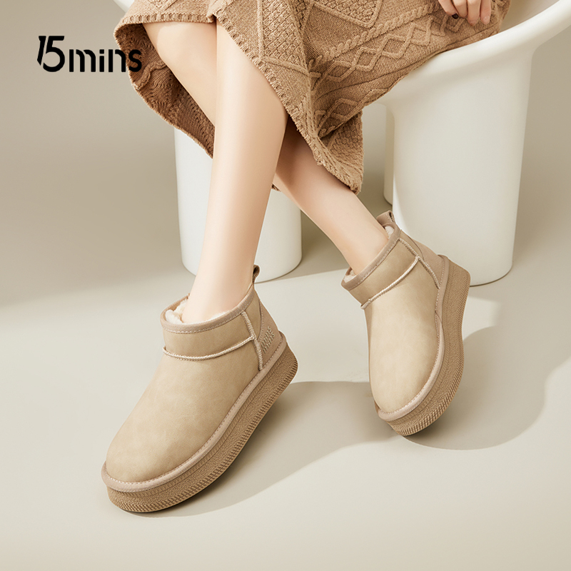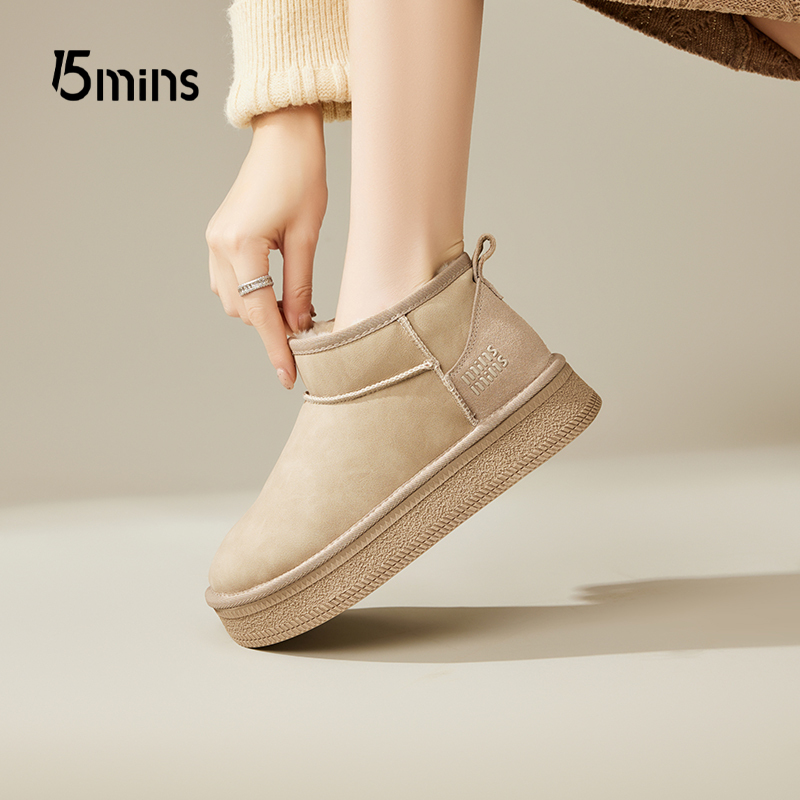 15mins加绒雪地靴女秋冬2025年新款厚底短靴保暖棉鞋百搭短筒靴子