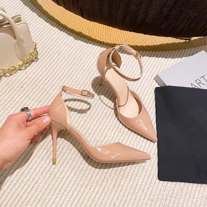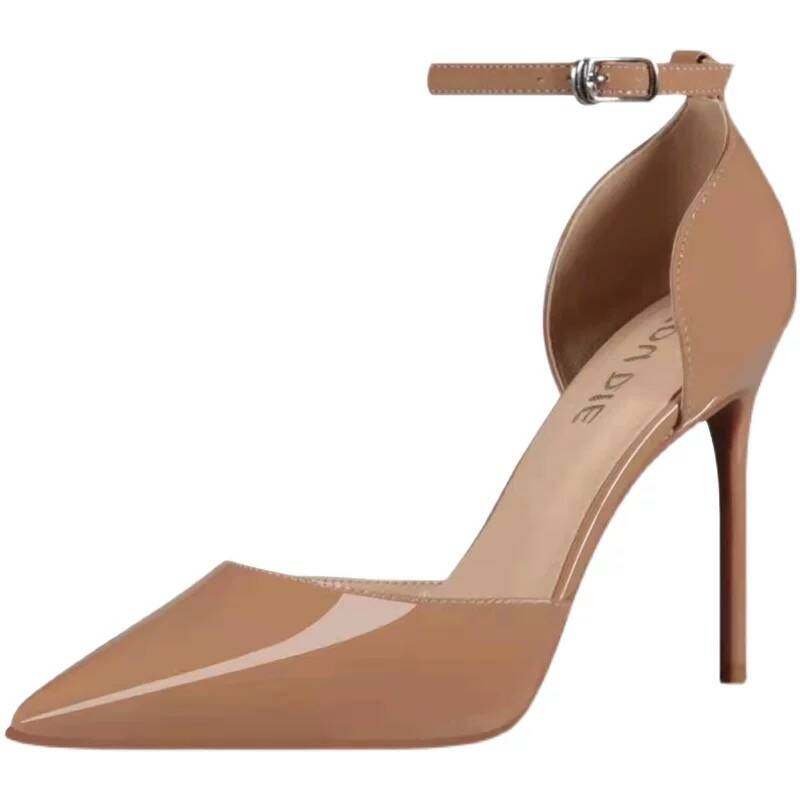 裸色高跟鞋女细跟一字扣中空单鞋