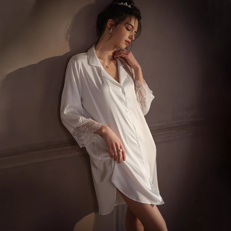 薄款男友风睡衣冰丝长袖白衬衫