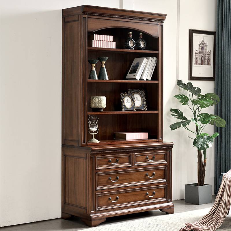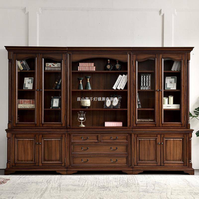 美式全实木书柜落地书房家具书橱组合黑胡桃木书架置物架带玻璃门