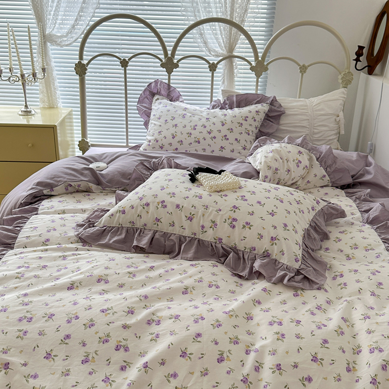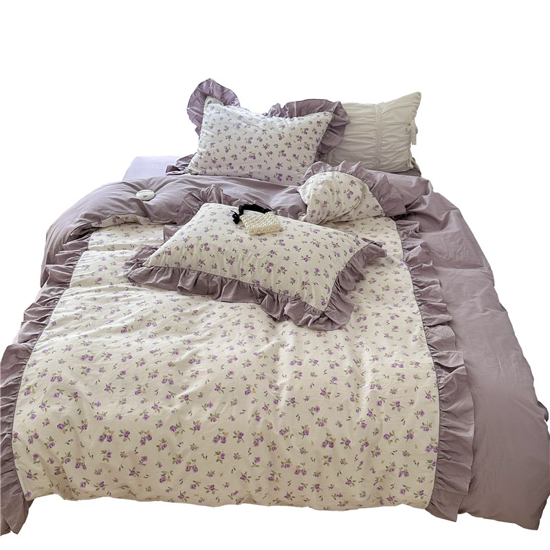 紫色小碎花纯棉床上四件套公主风花边款被套全棉小清新宿舍三件套